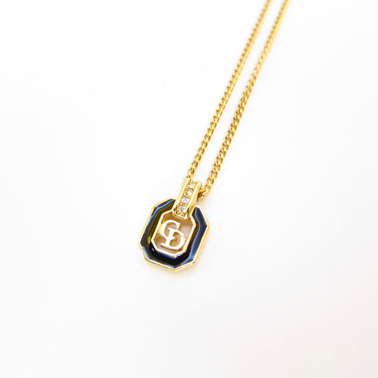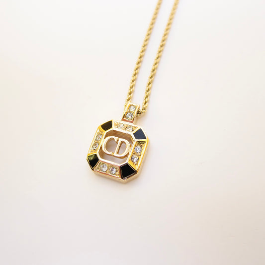 Christian Dior Vintage CD Logo in Octagon with Rhinestone Black and Golden Necklace