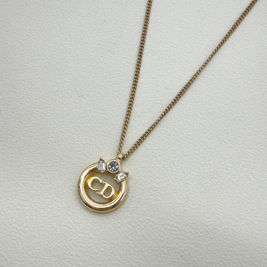 Christian Dior Vintage CD Logo in Circle with Rhinestone Golden Necklace