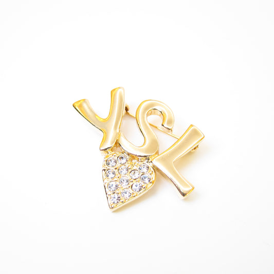 Yves Saint Laurent Vintage YSL Logo and Heart with Rhinestone Golden Brooch