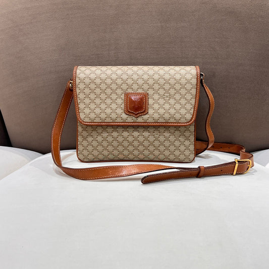 Celine Vintage Macadam Canvas Tan Leather Shoulder Bag