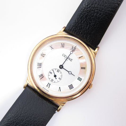 Celine Vintage Round White and Shell Pearl Face with Black Leather Strap Watch