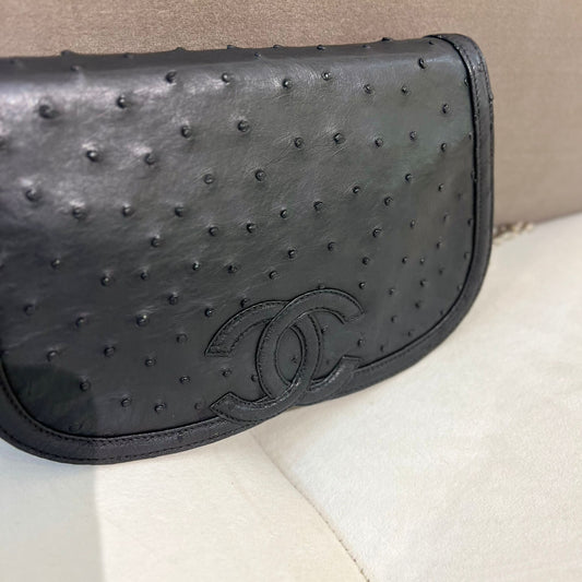 Chanel Vintage Black Ostrich Leather Chain Shoulder Bag