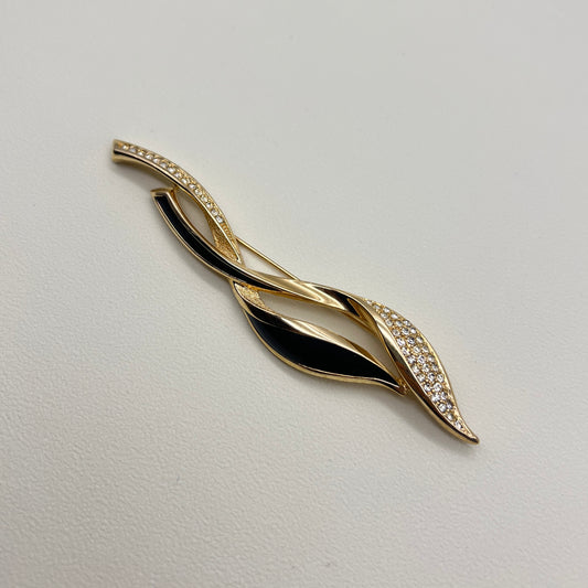 Christian Dior Vintage Leaf Motif Black and Rhinestone Golden Brooch