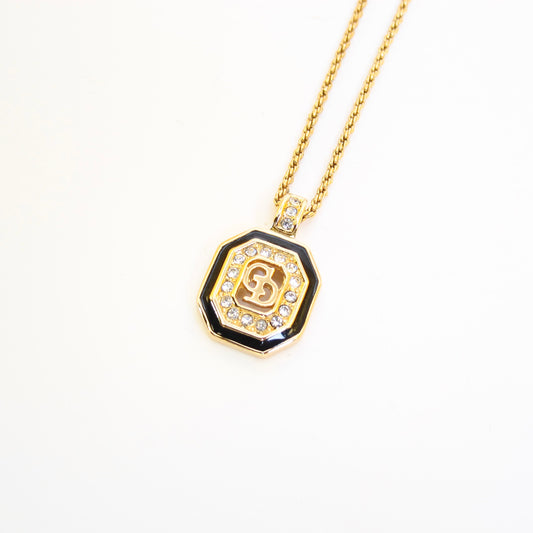 Christian Dior Vintage CD Logo in Octagon Black and Rhinestone Golden Necklace