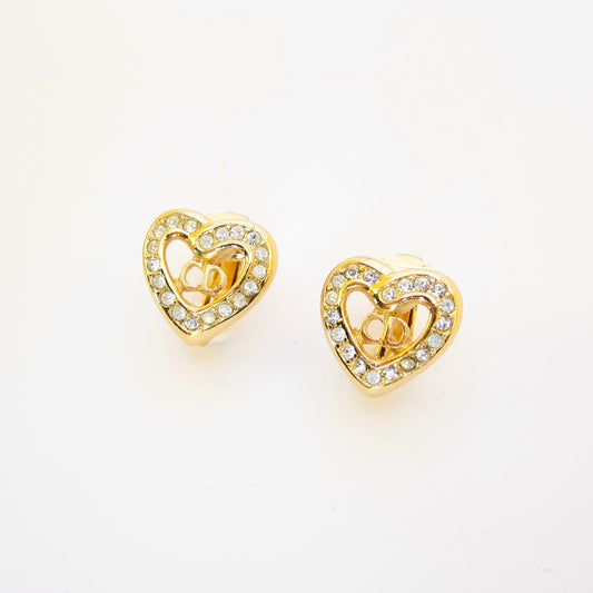 Christian Dior Vintage CD Logo in Heart with Rhinestone Golden Clip-on Earrings