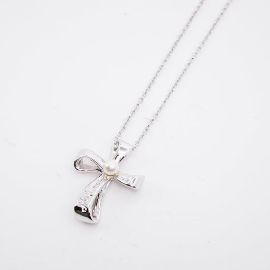 Mikimoto Vintage Logo Cross with Pearl Silver Necklace