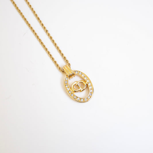 Christian Dior Vintage CD Logo in Oval Shape with Rhinestone Golden Necklace