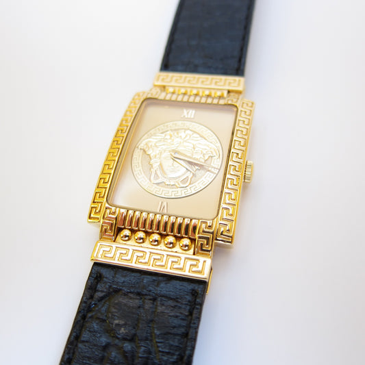 Gianni Versace Vintage Rectangle Gold Frame Yellow Face with Medusa Black Leather Strap Watch