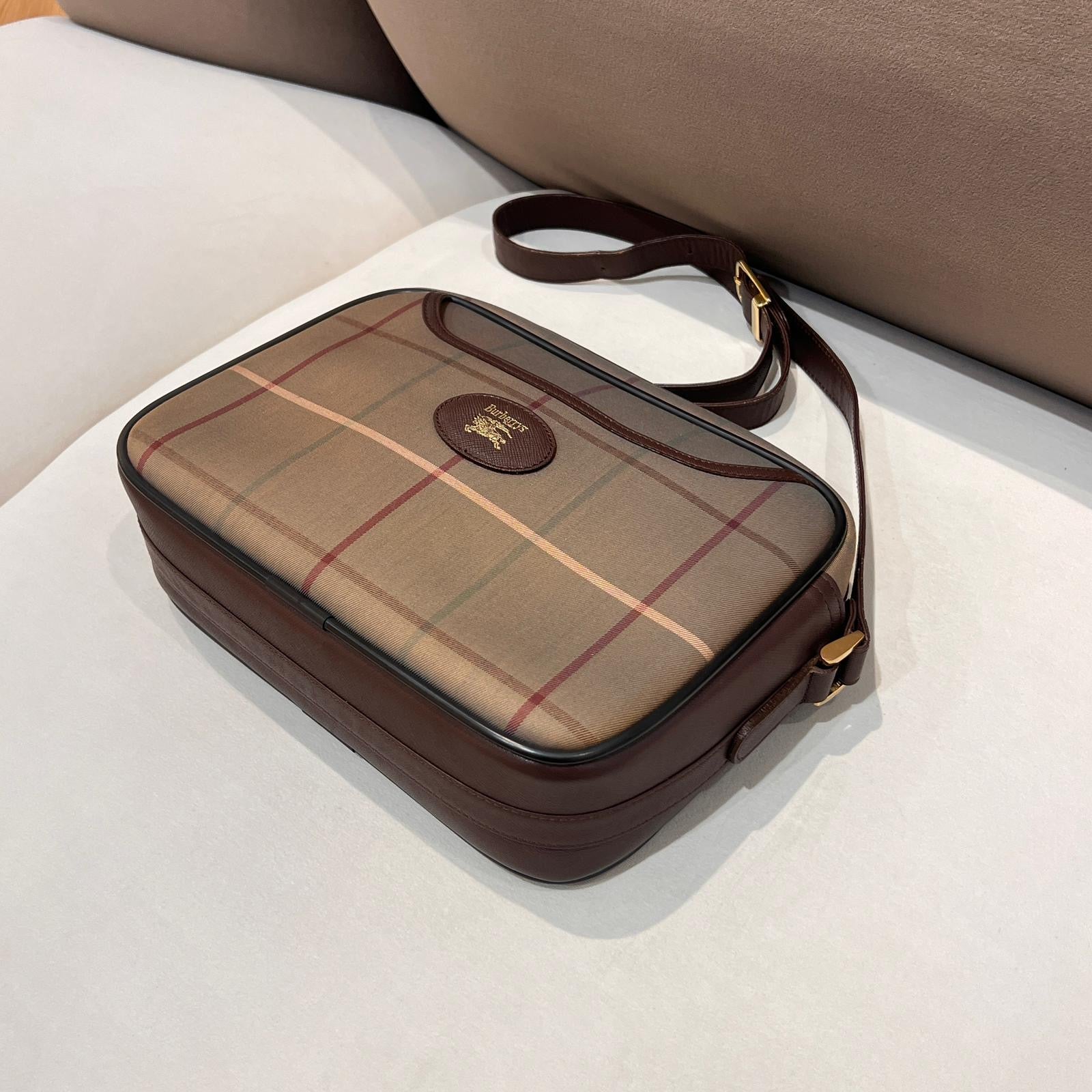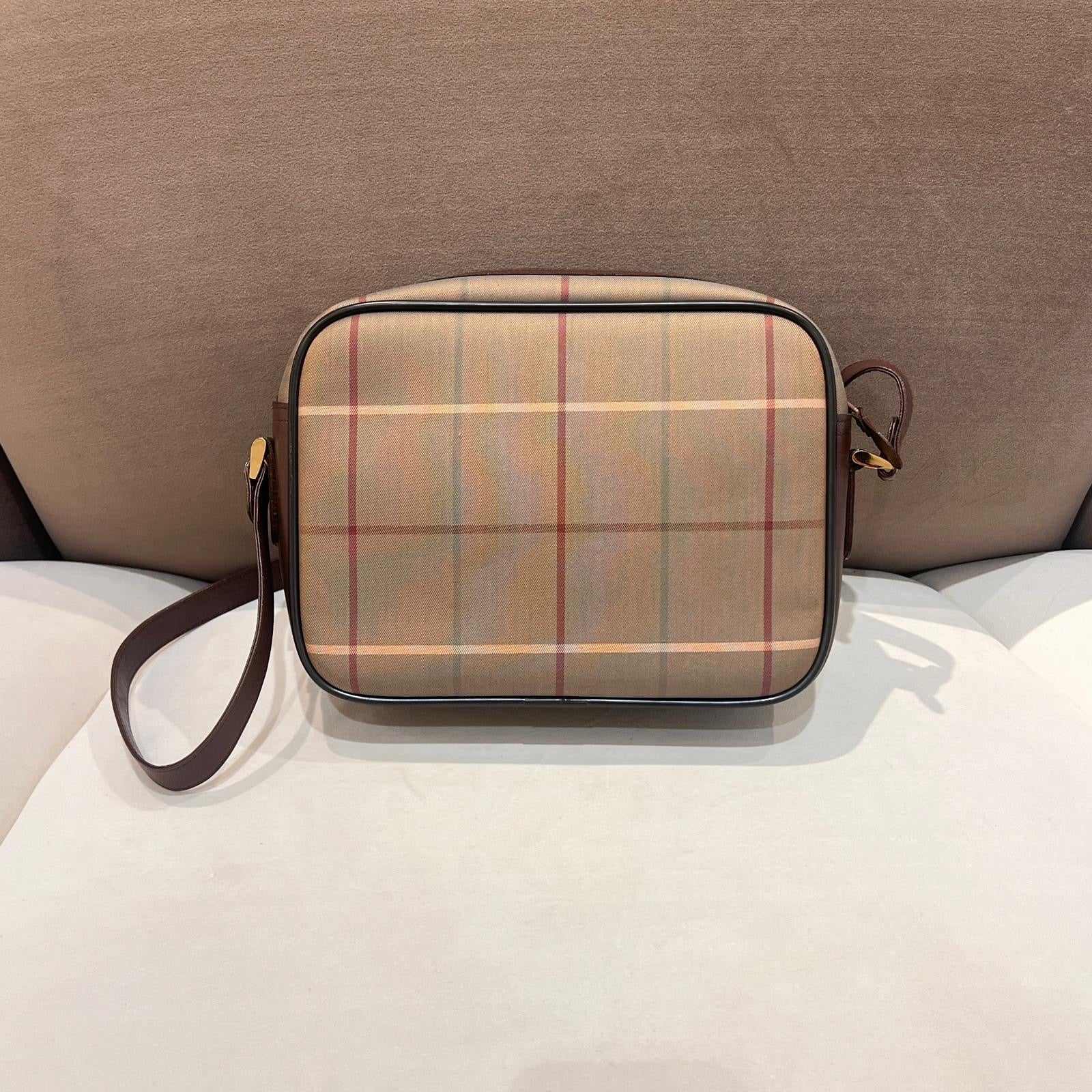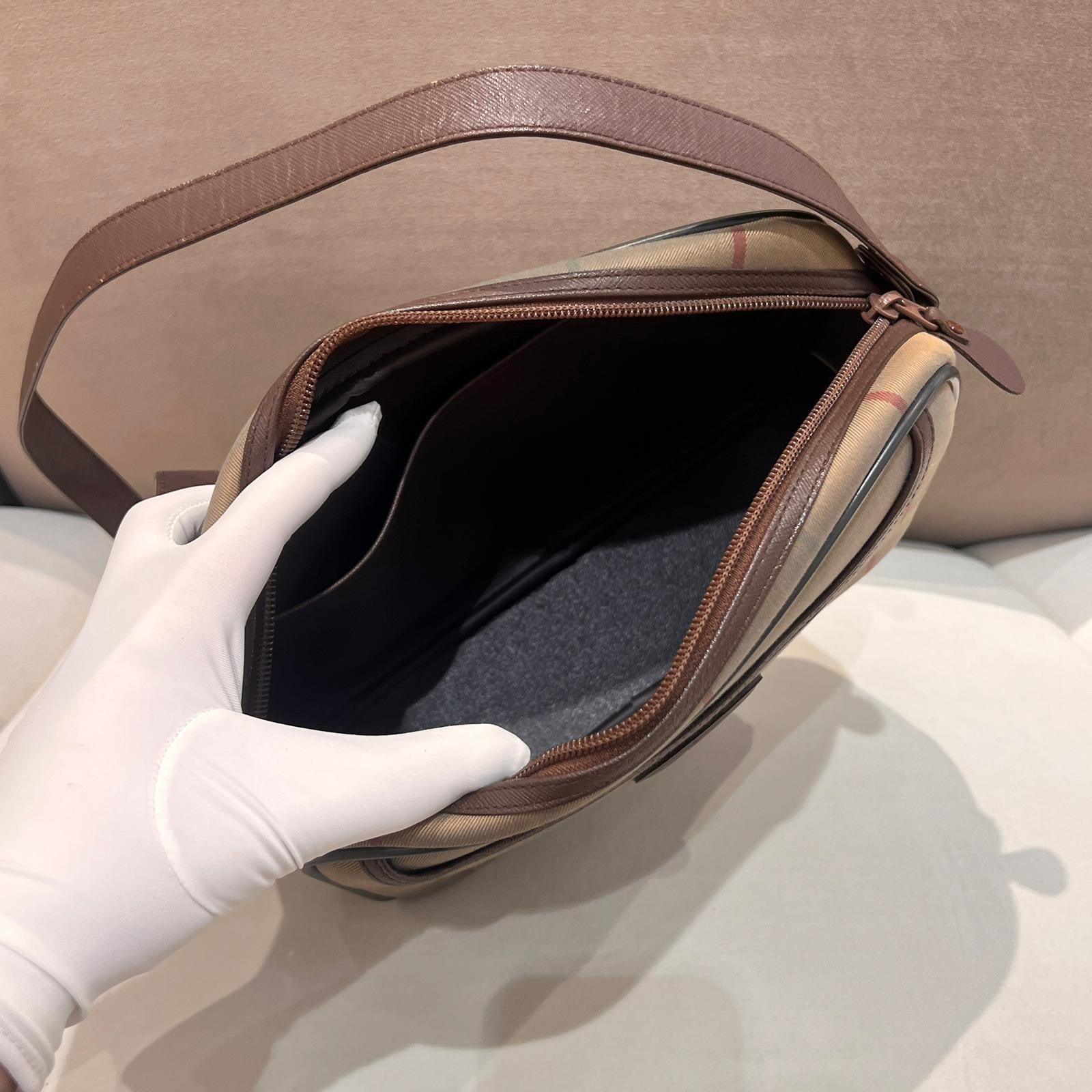 此款 Burberry 中古肩背袋採用品牌標誌性米色 Nova Check 格紋帆布,配以棕色皮革包邊及拉鍊開口設計,結構分明而實用。