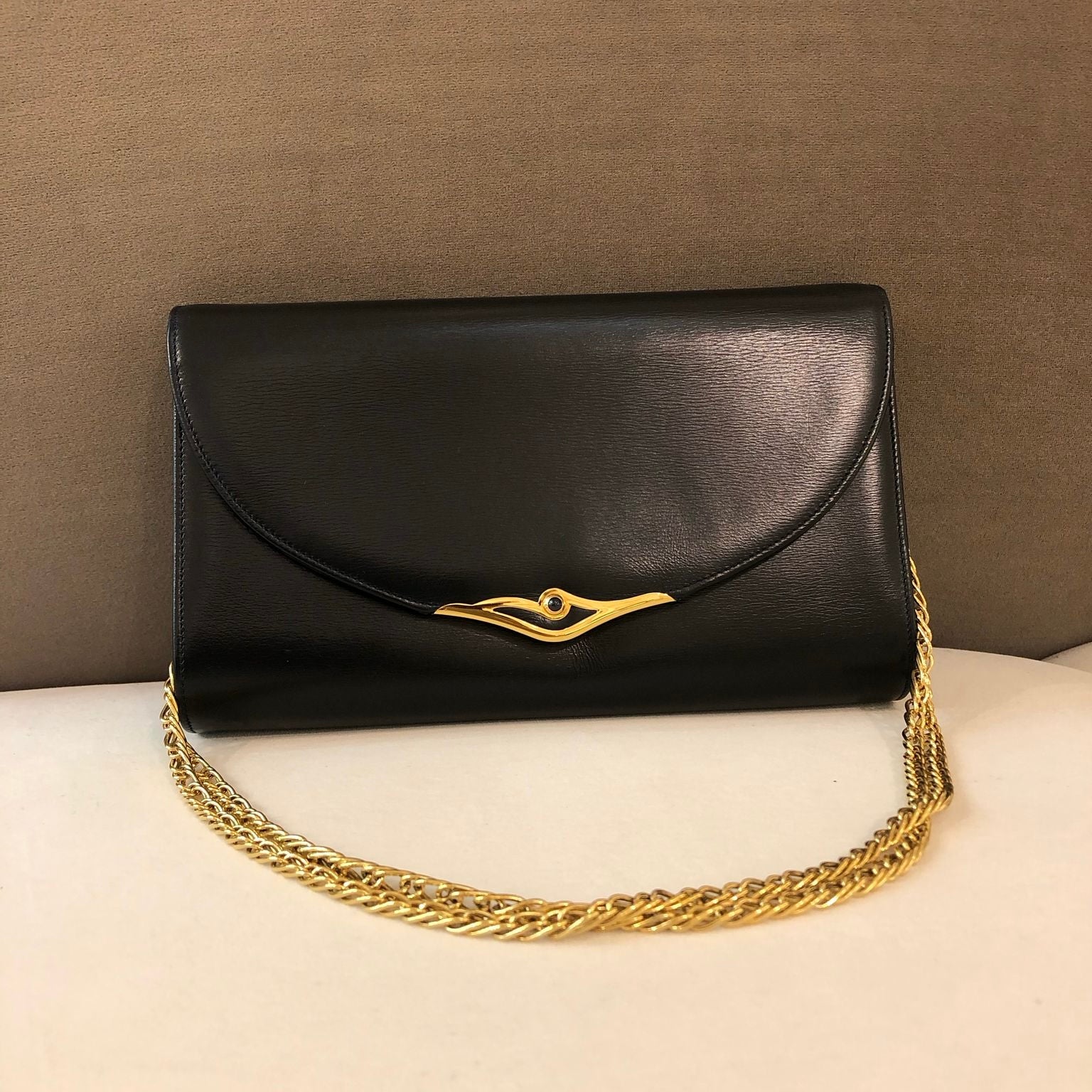 This Cartier vintage shoulder bag is a sleek blend of elegance and function. The structured design in jet-black leather is paired with a gold-tone clasp featuring the iconic Cartier 'eye' motif. This piece from the Sapphire line remains a sought-after classic for its subtle symbolism and fine craftsmanship.