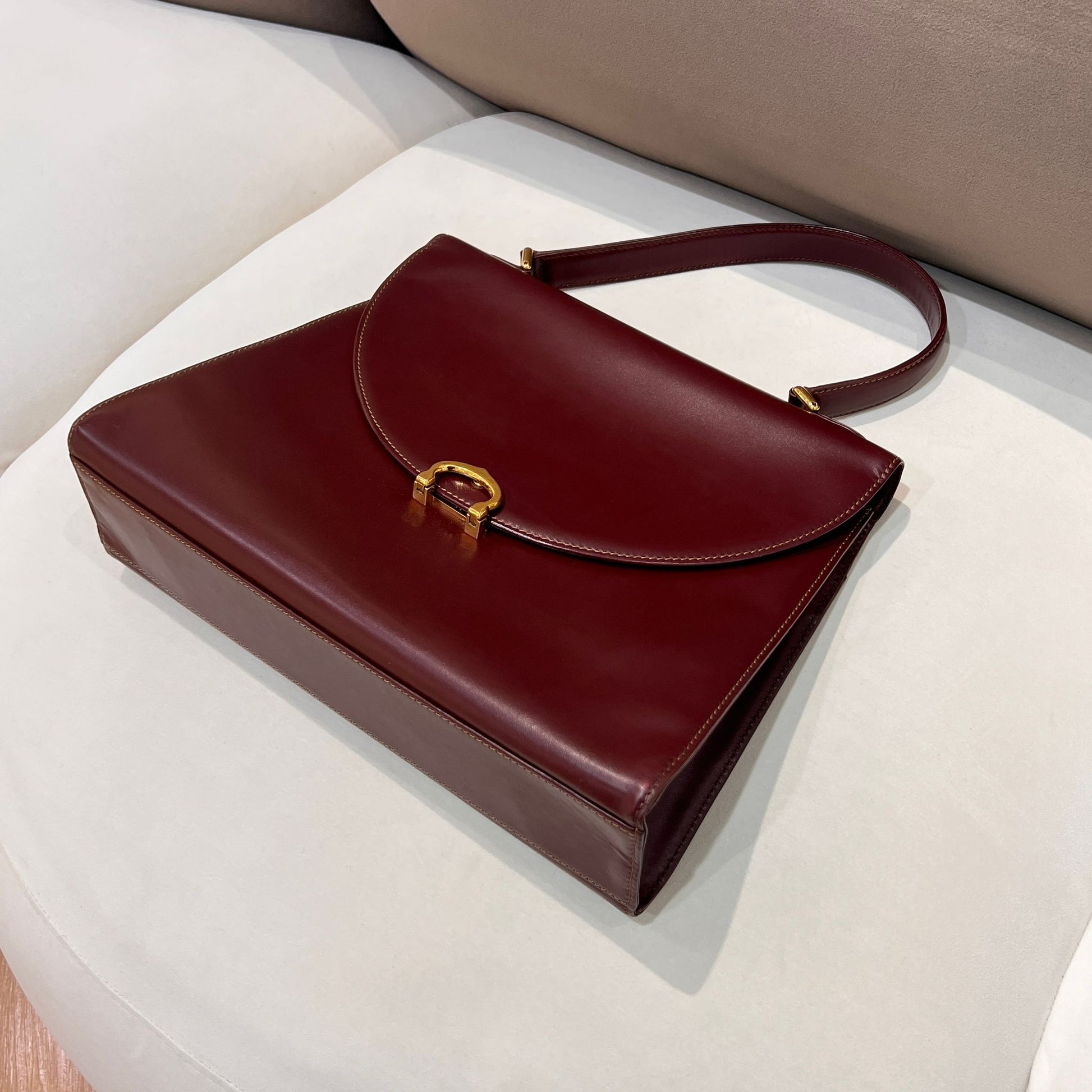 This vintage Must de Cartier handbag is crafted from smooth Bordeaux leather, featuring the brand’s signature half-arch gold clasp. The elegant top-handle silhouette embodies Cartier’s jewelry-inspired refinement from the 1980s–1990s.