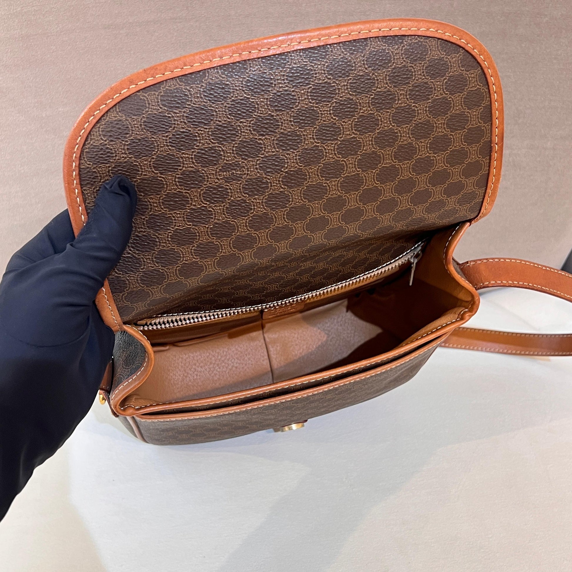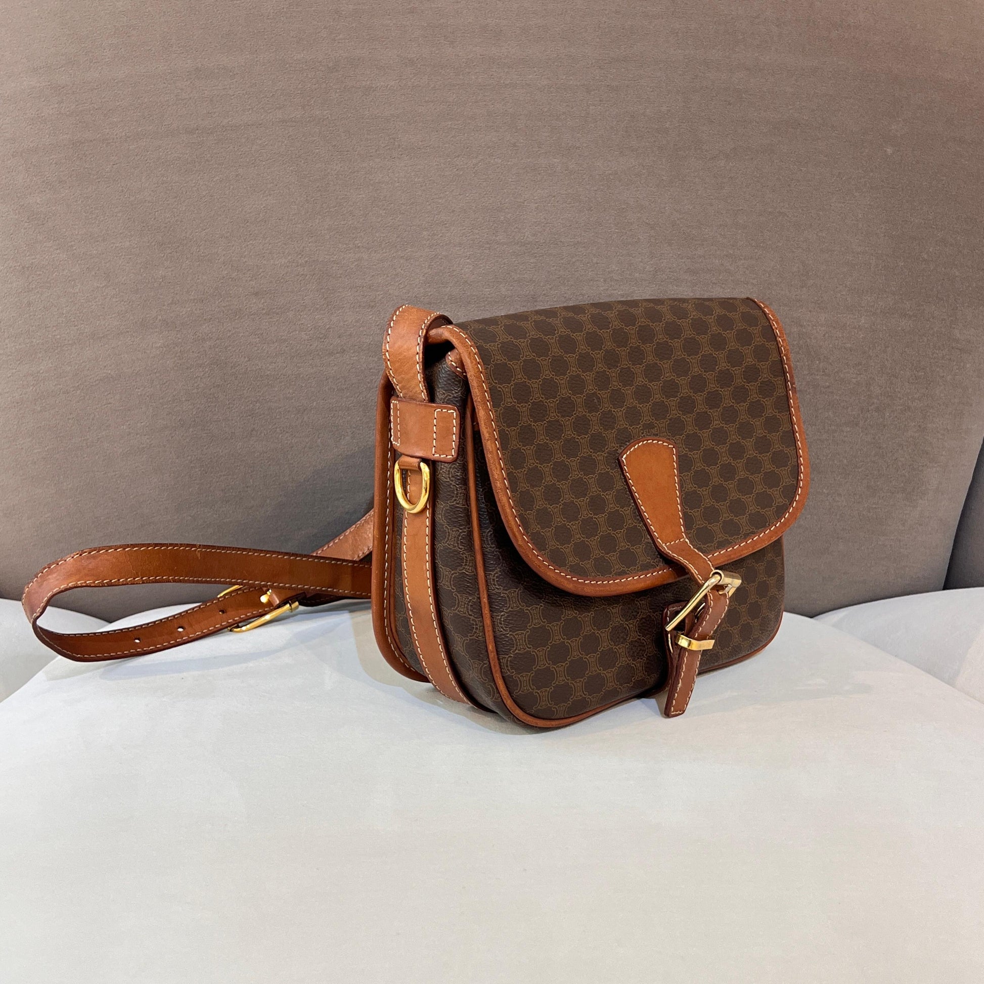 這款 Celine 肩背包採用品牌經典 Macadam 老花帆布,搭配深啡色皮革飾邊,翻蓋以復古扣飾點綴,肩帶可調節,兼具實用與高雅。