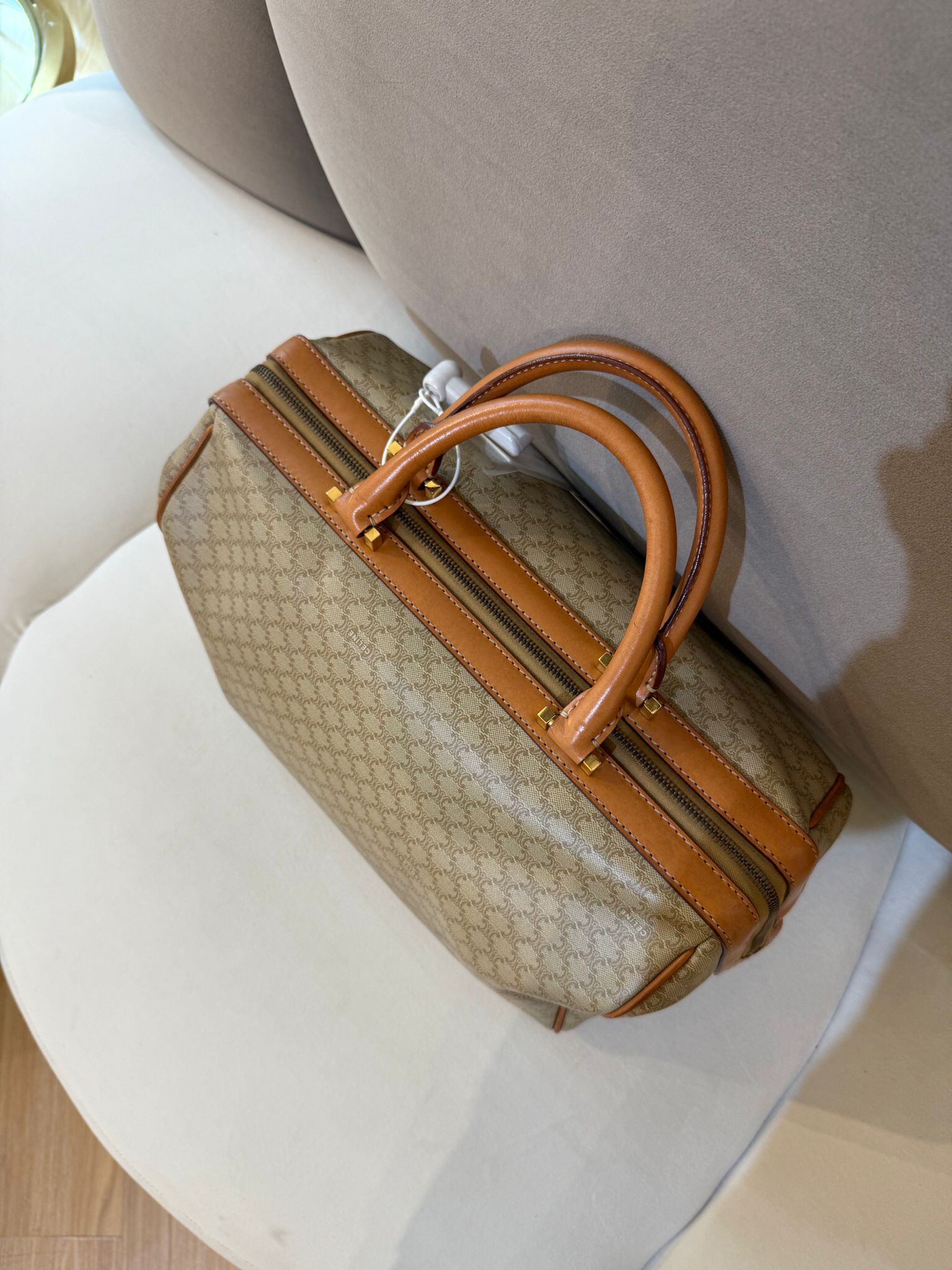 這款 Celine 中古手袋以品牌標誌性的米色 Macadam 老花帆布製成,搭配天然皮革飾邊與圓弧手柄。袋型挺身,既實用又優雅,無論日常或旅行皆適合。