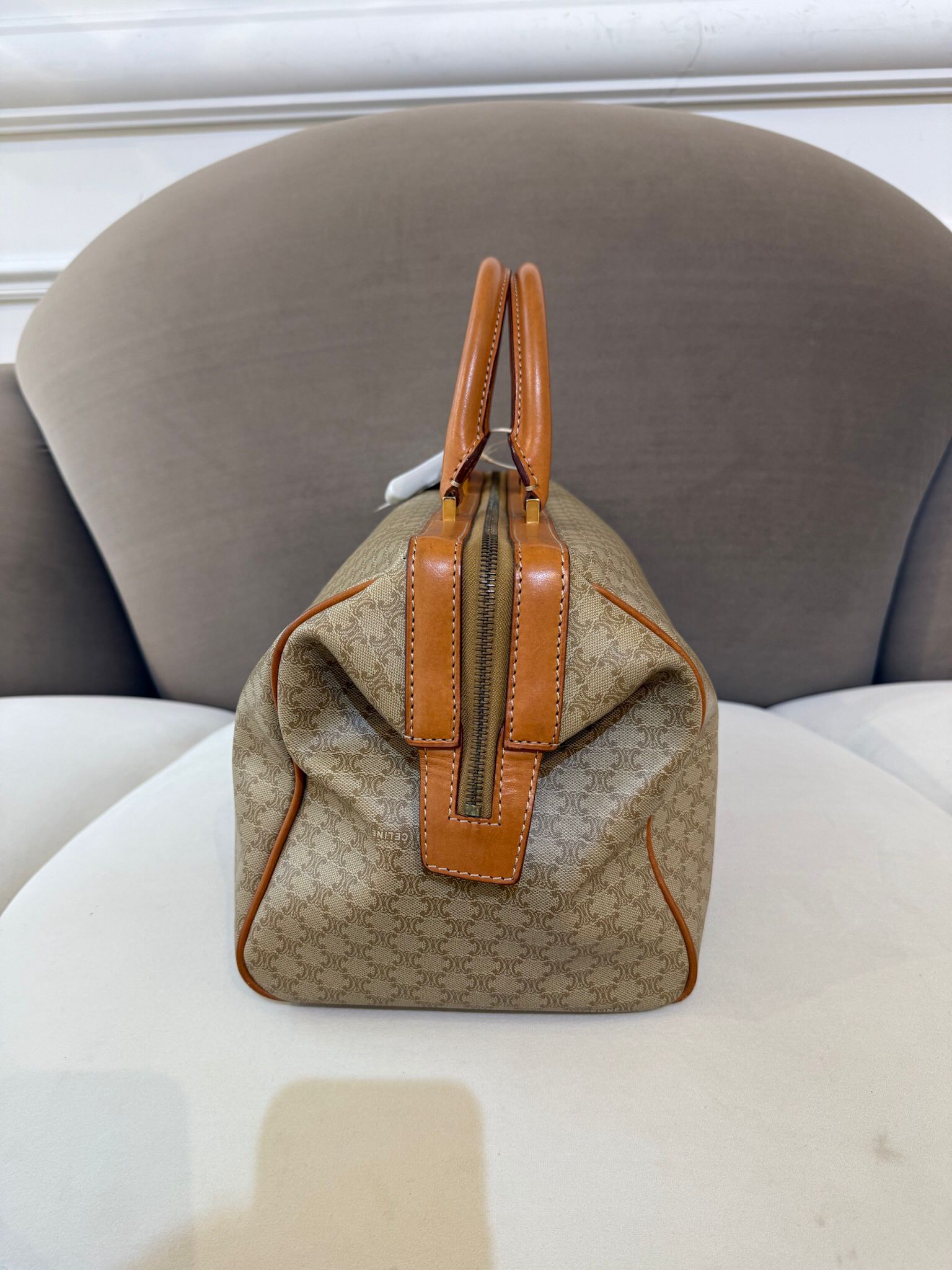 Celine Vintage Macadam Canvas Beige Leather Boston Handbag