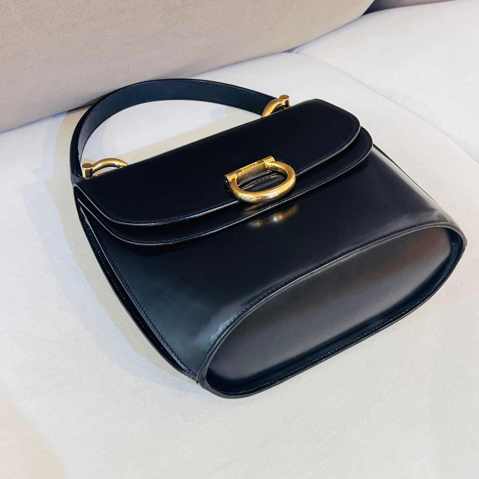 This vintage Celine handbag is crafted in supple black leather and accented with the house’s signature gold-tone Gancini clasp. The structured top handle silhouette embodies Parisian sophistication with understated charm.