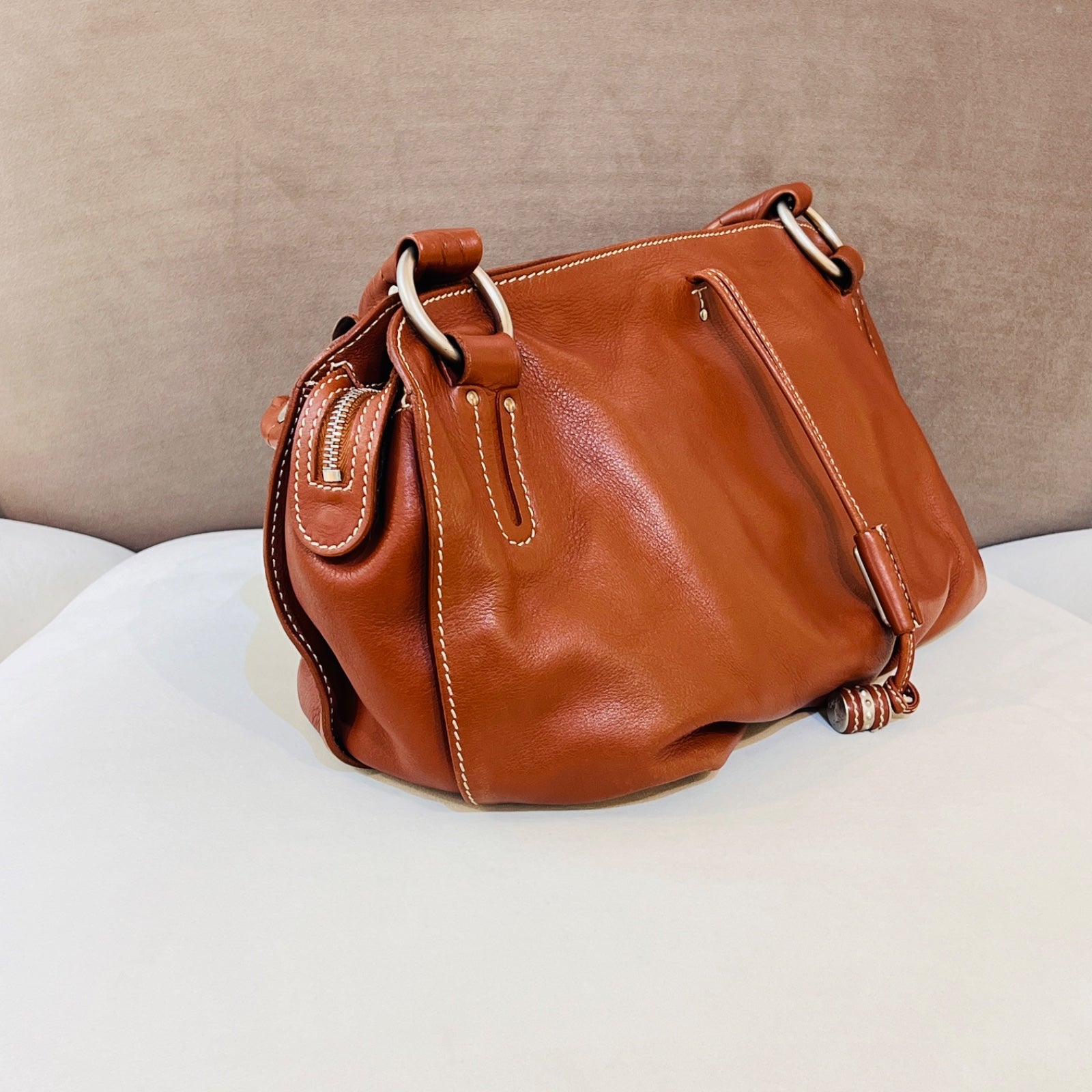 The Celine Bittersweet bag is crafted in supple brown leather with a semi-shoulder silhouette that blends elegance and ease. Its silver-tone ring details and relaxed draping reflect Celine’s refined yet modern approach to luxury.