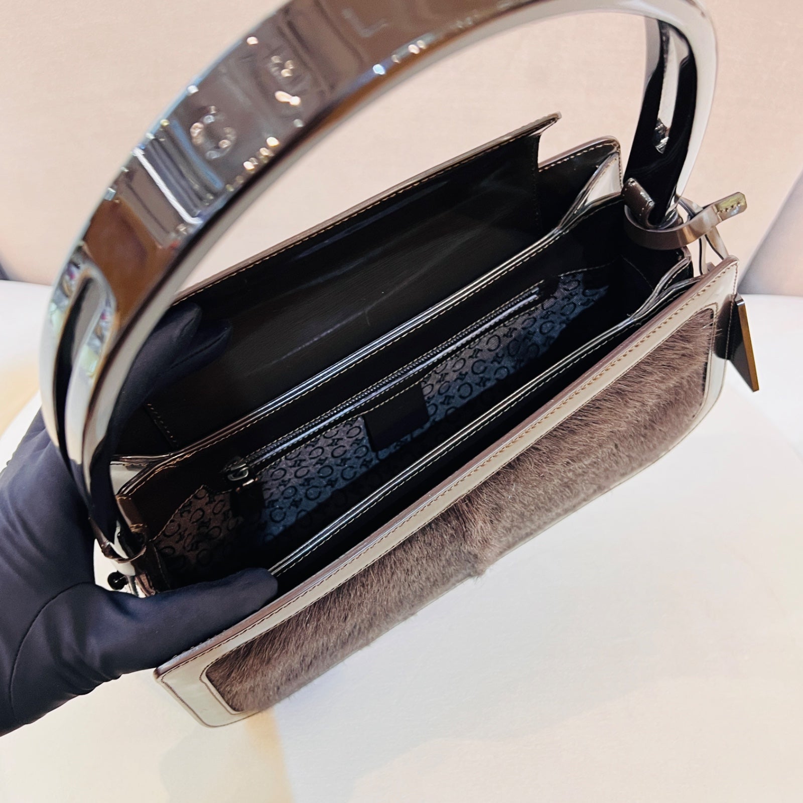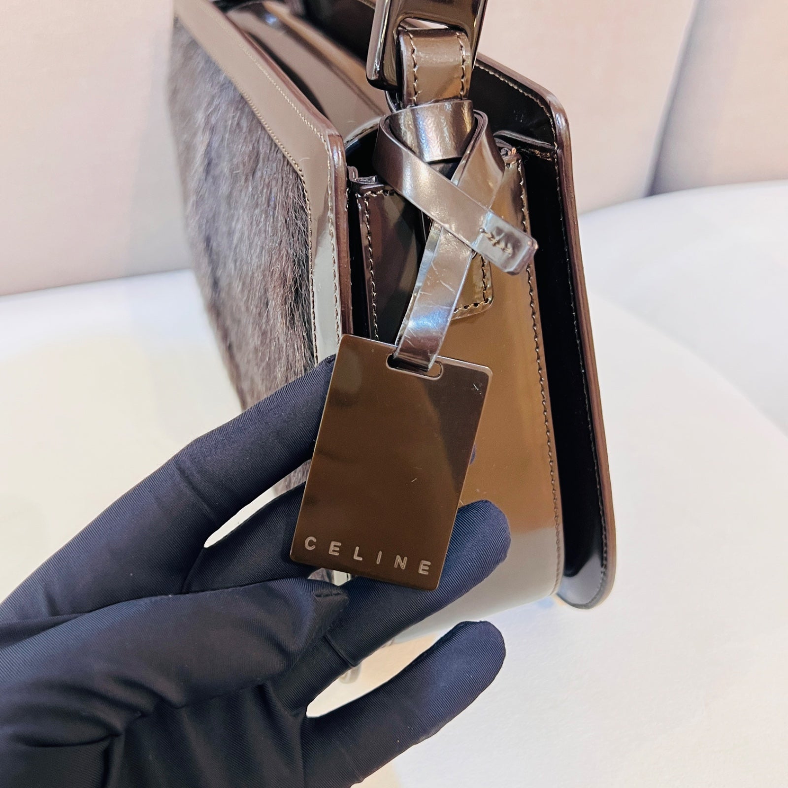 這款罕見的 Celine Harako 手袋,以棕色順滑皮革配搭小牛毛拼接設計,營造奢華獨特的質感對比。方形挺身袋型,既實用又優雅,極具收藏價值。