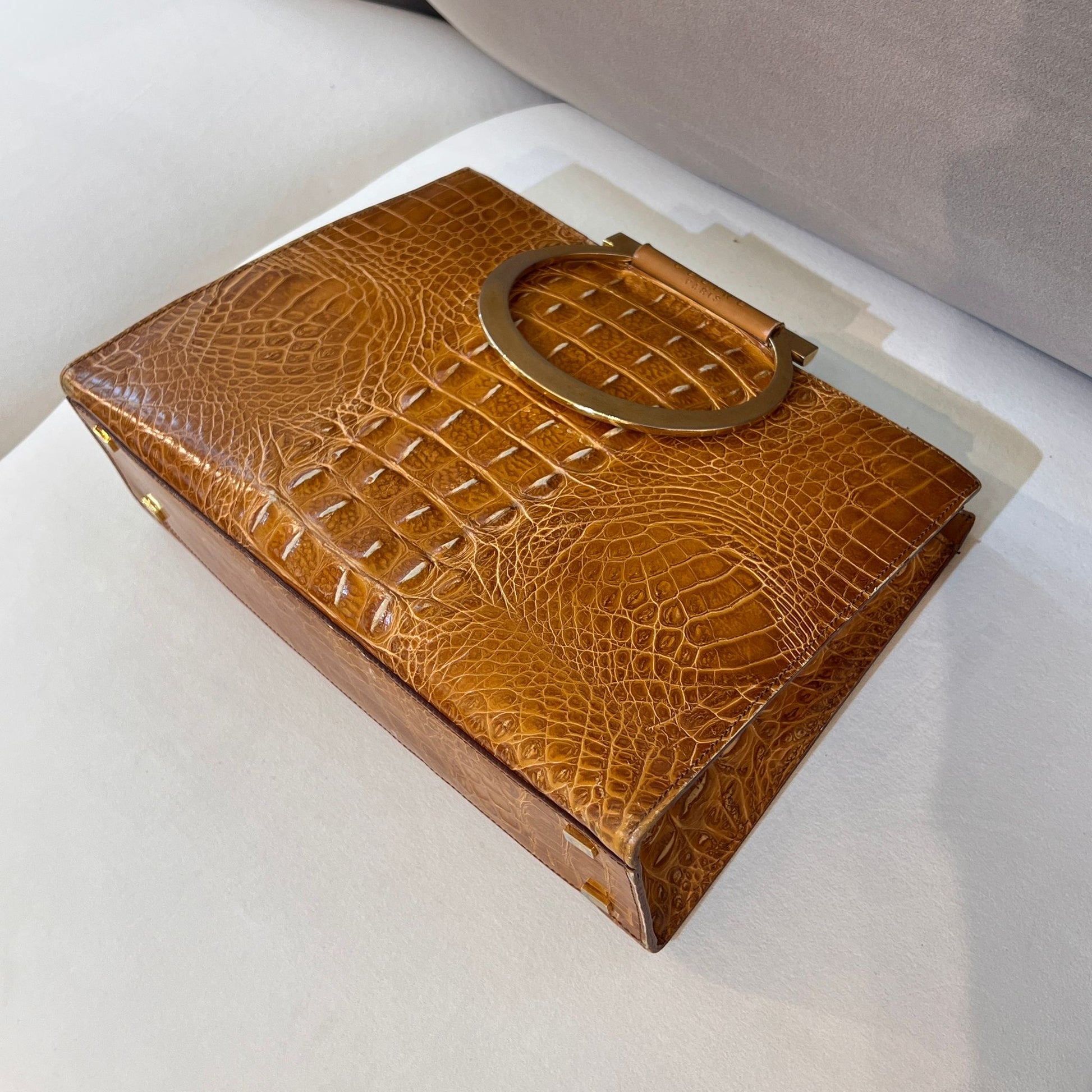 這款罕見的Celine復古手袋採用鱷魚壓紋皮革,配以品牌標誌性的金色圓形手挽,體現70至80年代Celine剛柔並重的設計精神。