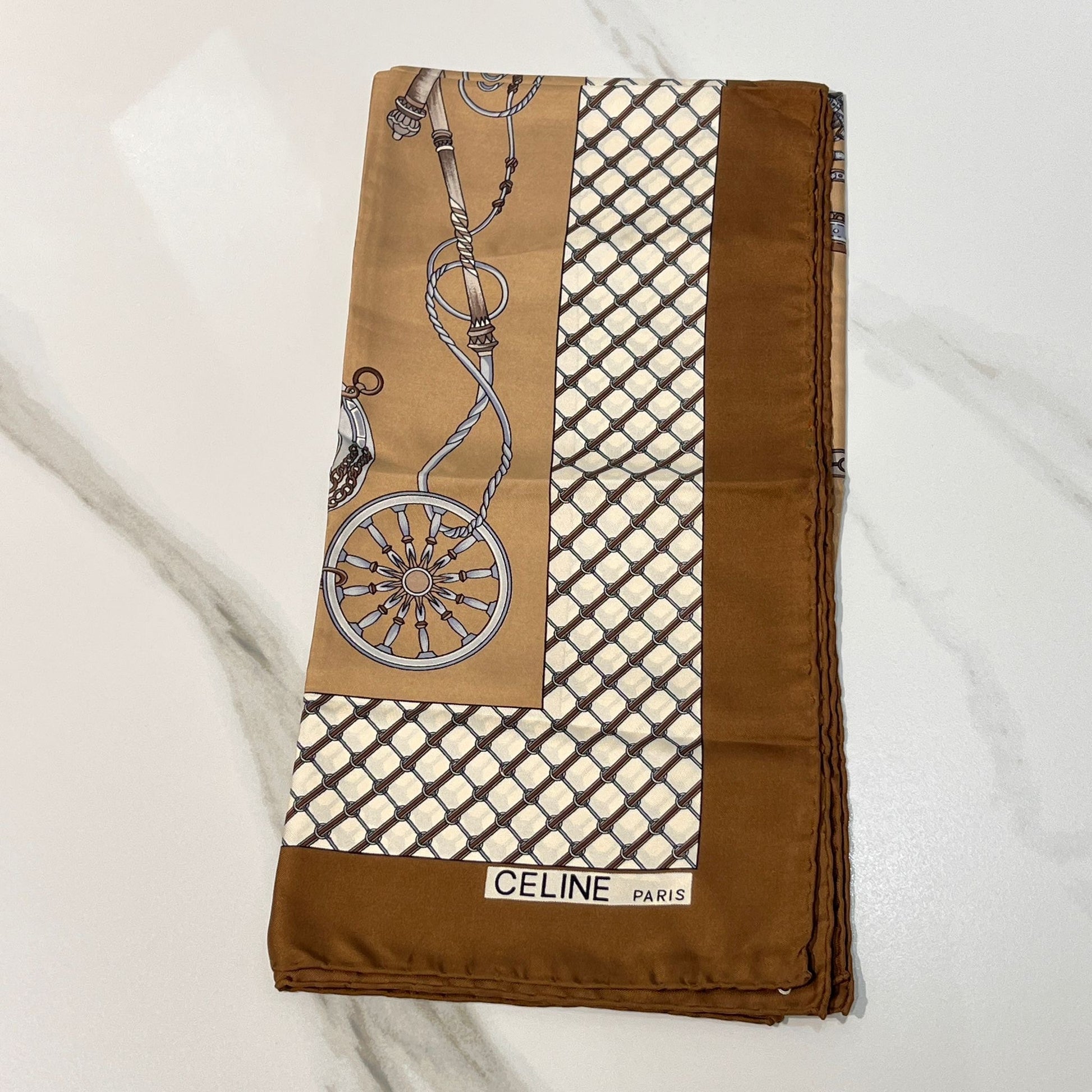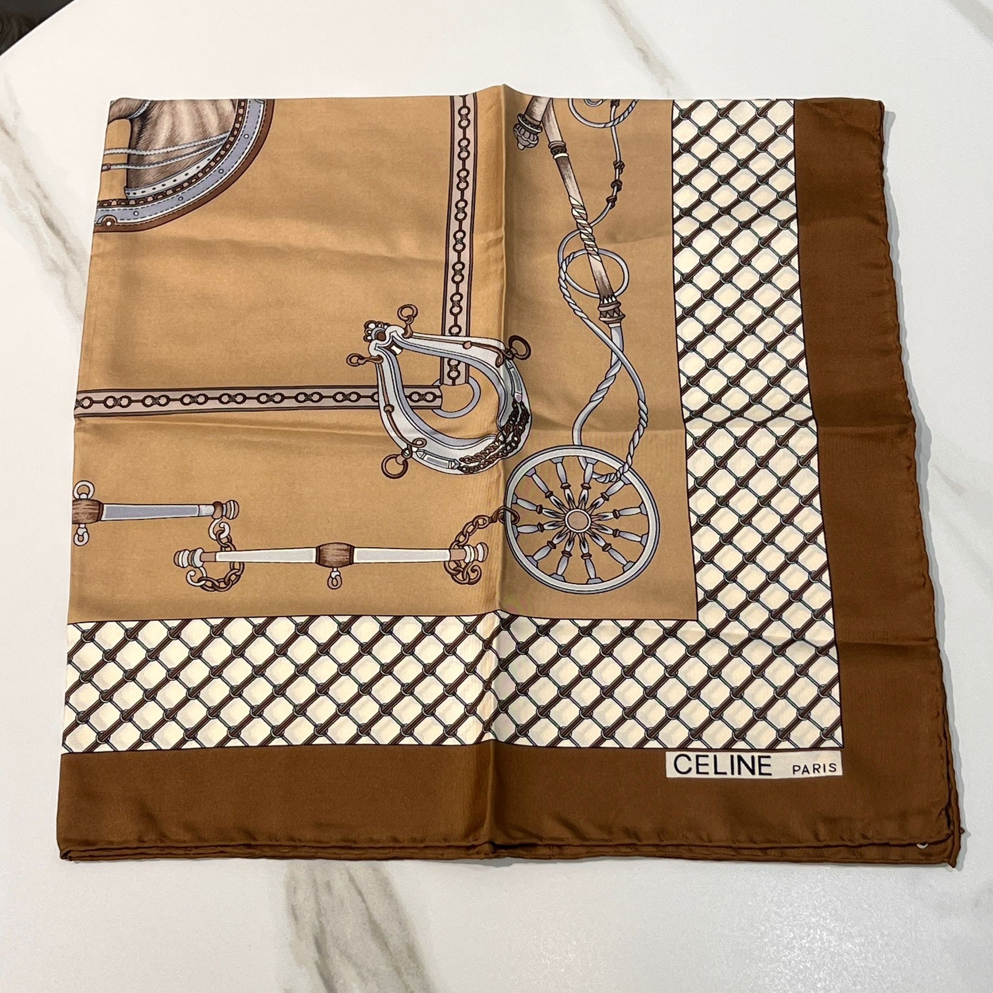 Celine Vintage Carriage Chain Print Silk Scarf Beige Brown 88 X 88 Cm