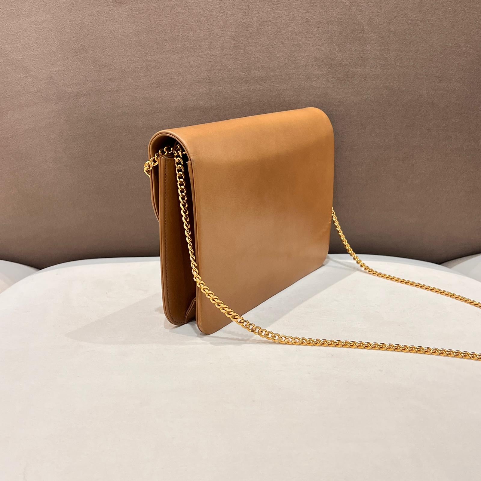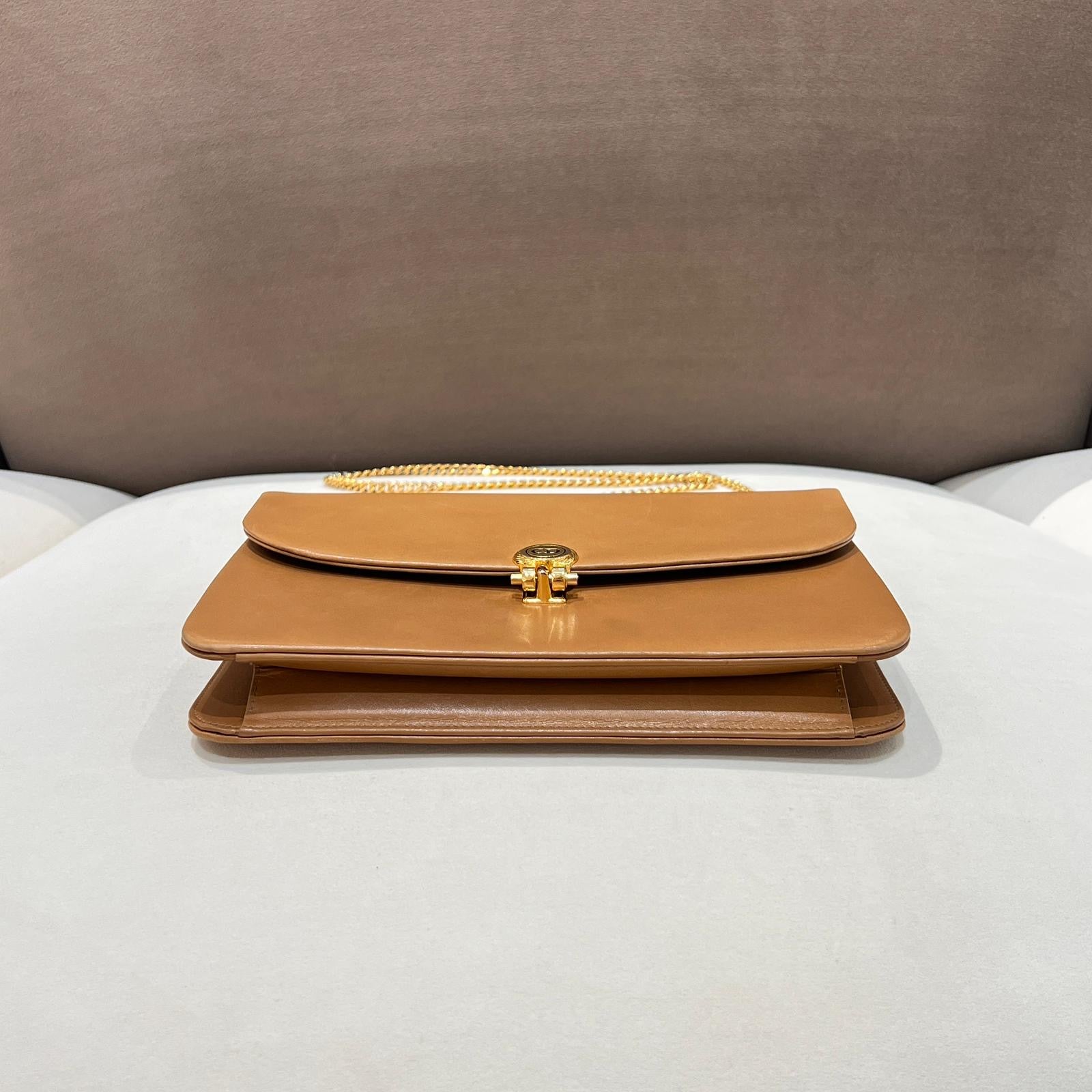 This vintage Dior shoulder bag highlights the Maison’s signature elegance with its smooth beige leather body, structured silhouette, and iconic CD medallion push-lock. The gold-tone chain strap adds a refined Parisian touch, making it an effortless companion for both day and evening occasions.
