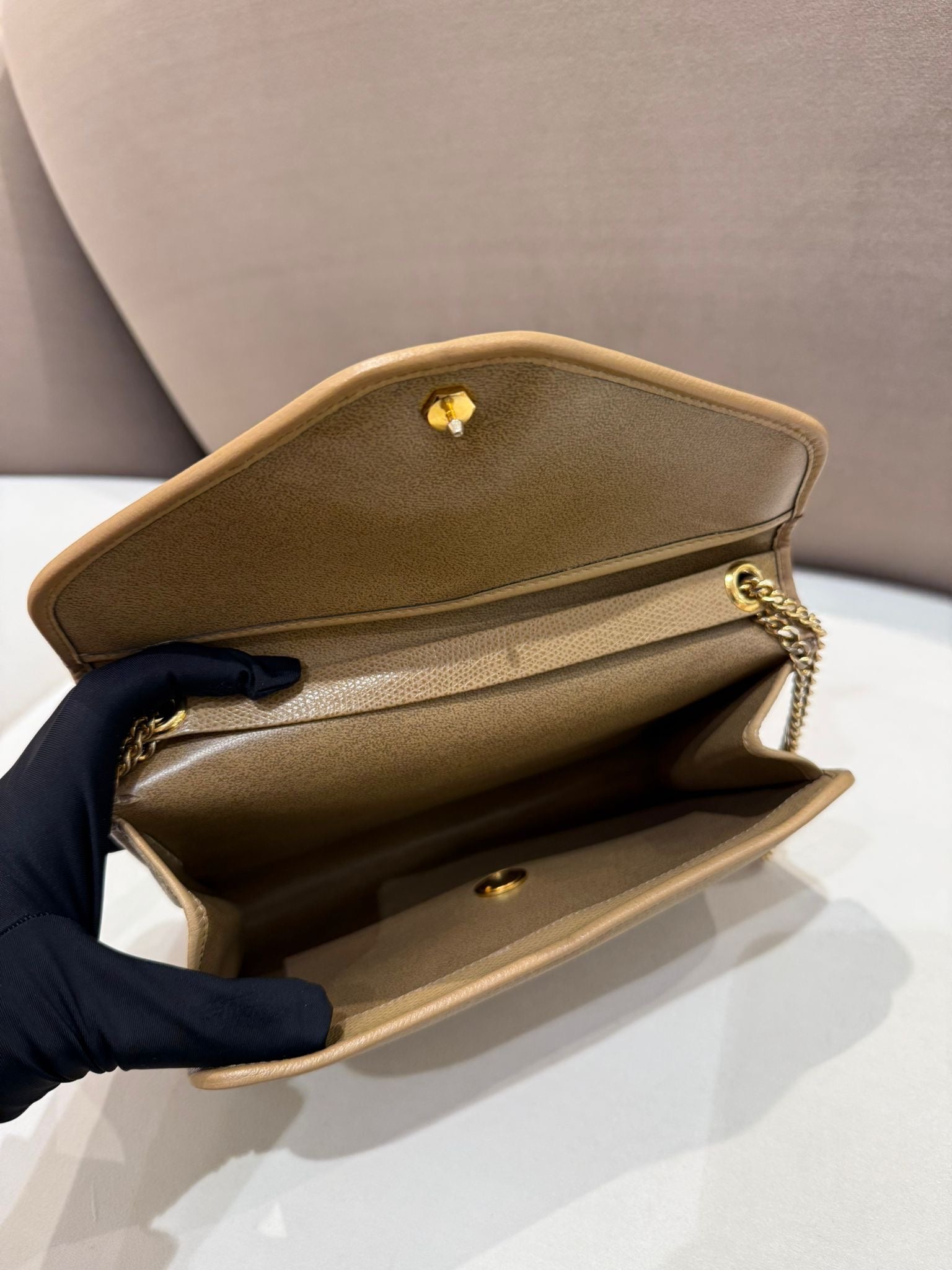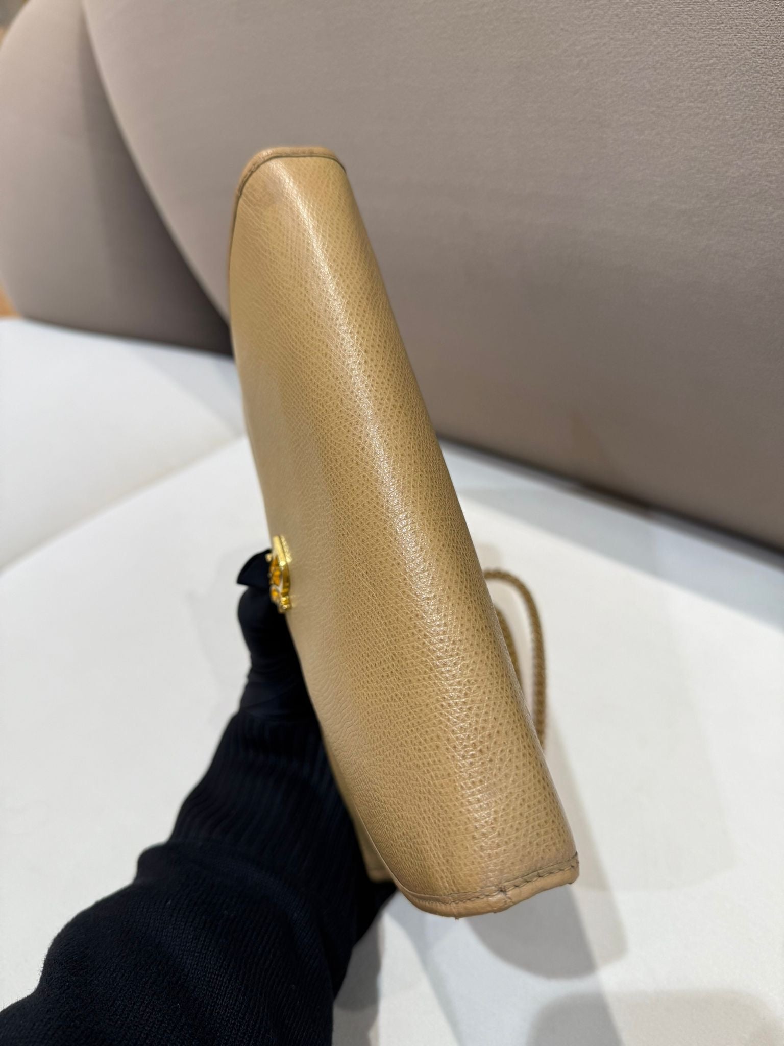 此款Christian Dior中古肩背袋選用優雅米色皮革製作,配以細緻金色鏈帶及翻蓋上的Dior標誌,線條簡潔俐落,展現品牌對女性美感與經典設計的堅持。