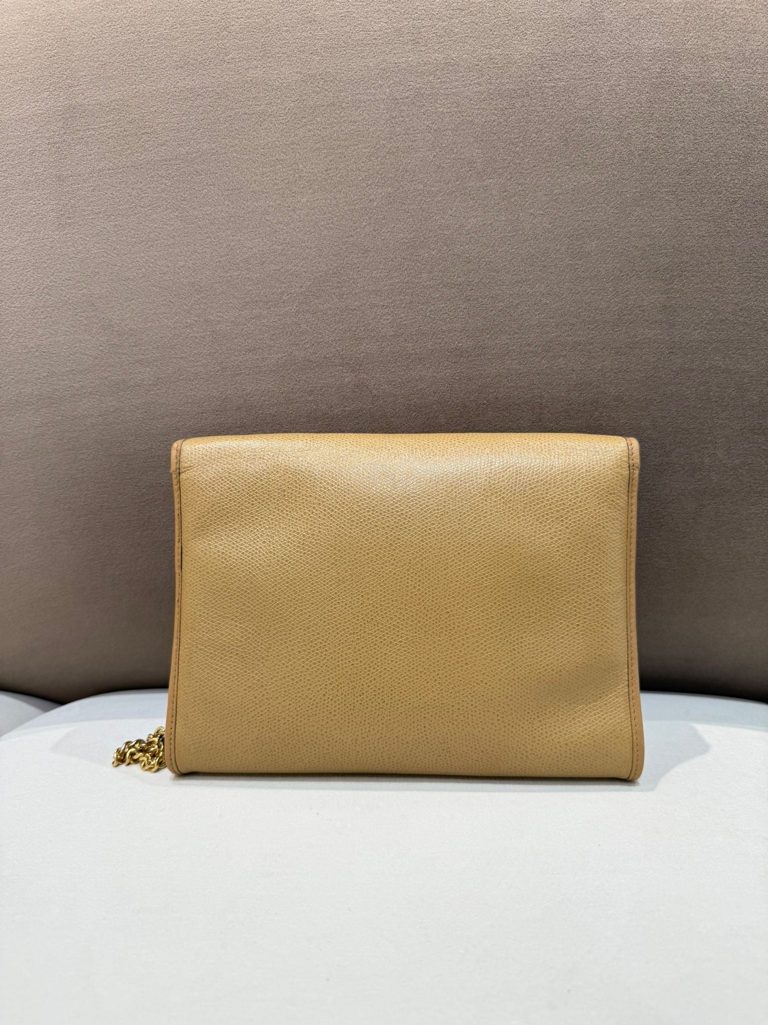 This vintage Christian Dior shoulder bag is crafted in elegant beige leather, finished with a delicate gold-tone chain strap and a signature Dior logo on the flap. The clean envelope silhouette reflects the house’s refined approach to femininity and timeless luxury.