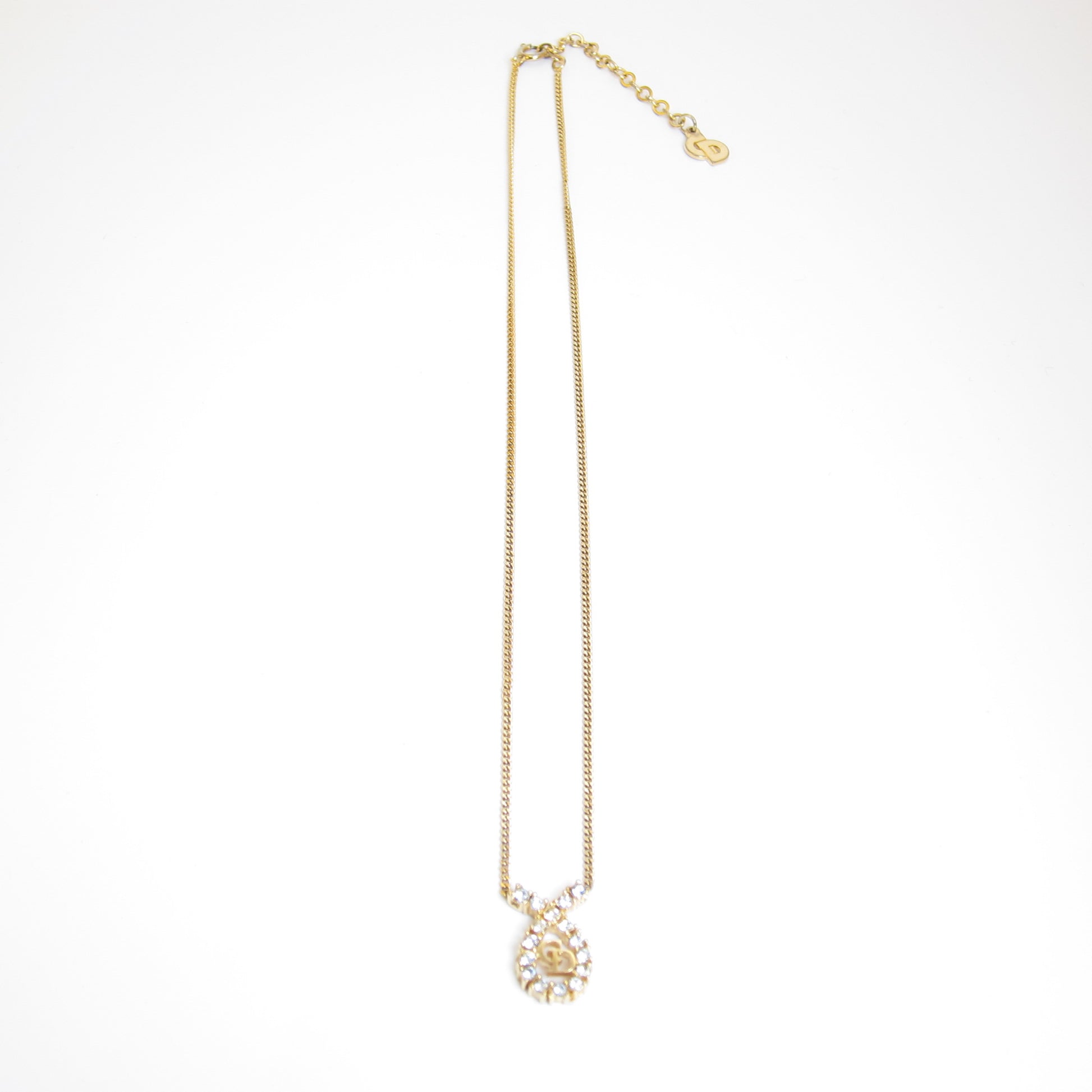 Christian Dior Vintage CD Logo in Drop Shape with Rhinestone Golden Necklace