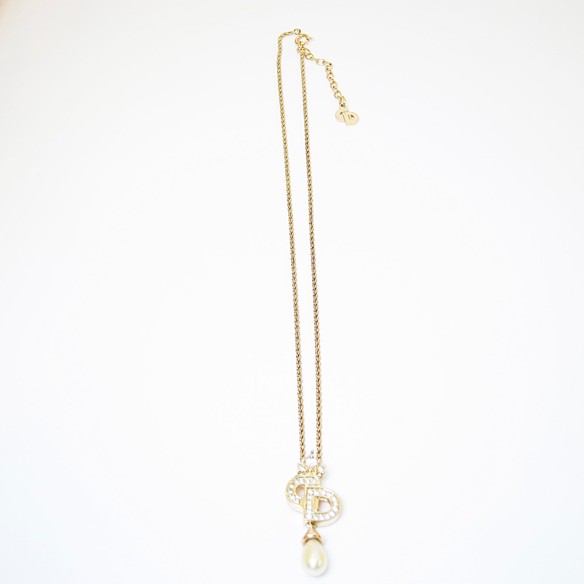 Christian Dior Vintage CD Logo with Rhinestone and Pearl Golden Necklace