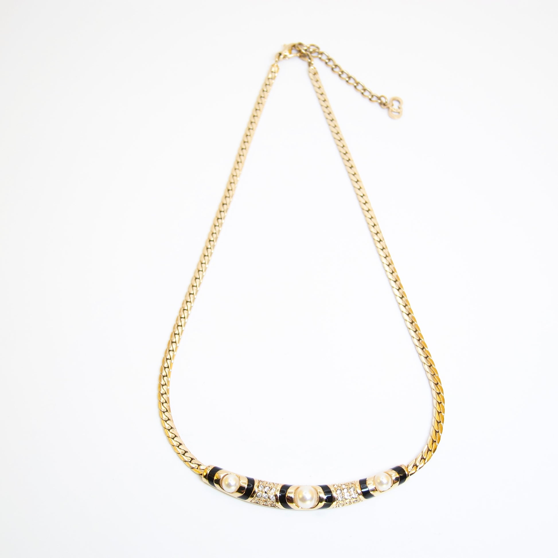 Christian Dior Vintage Pearl and Rhinestone Black and Golden Necklace