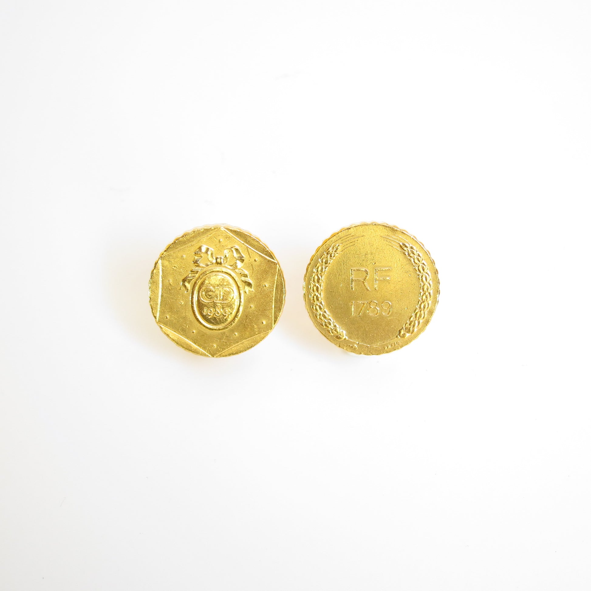 Christian Dior Vintage CD Logo on Round and RF 1789 Coin Motif Golden Clip-on Earrings