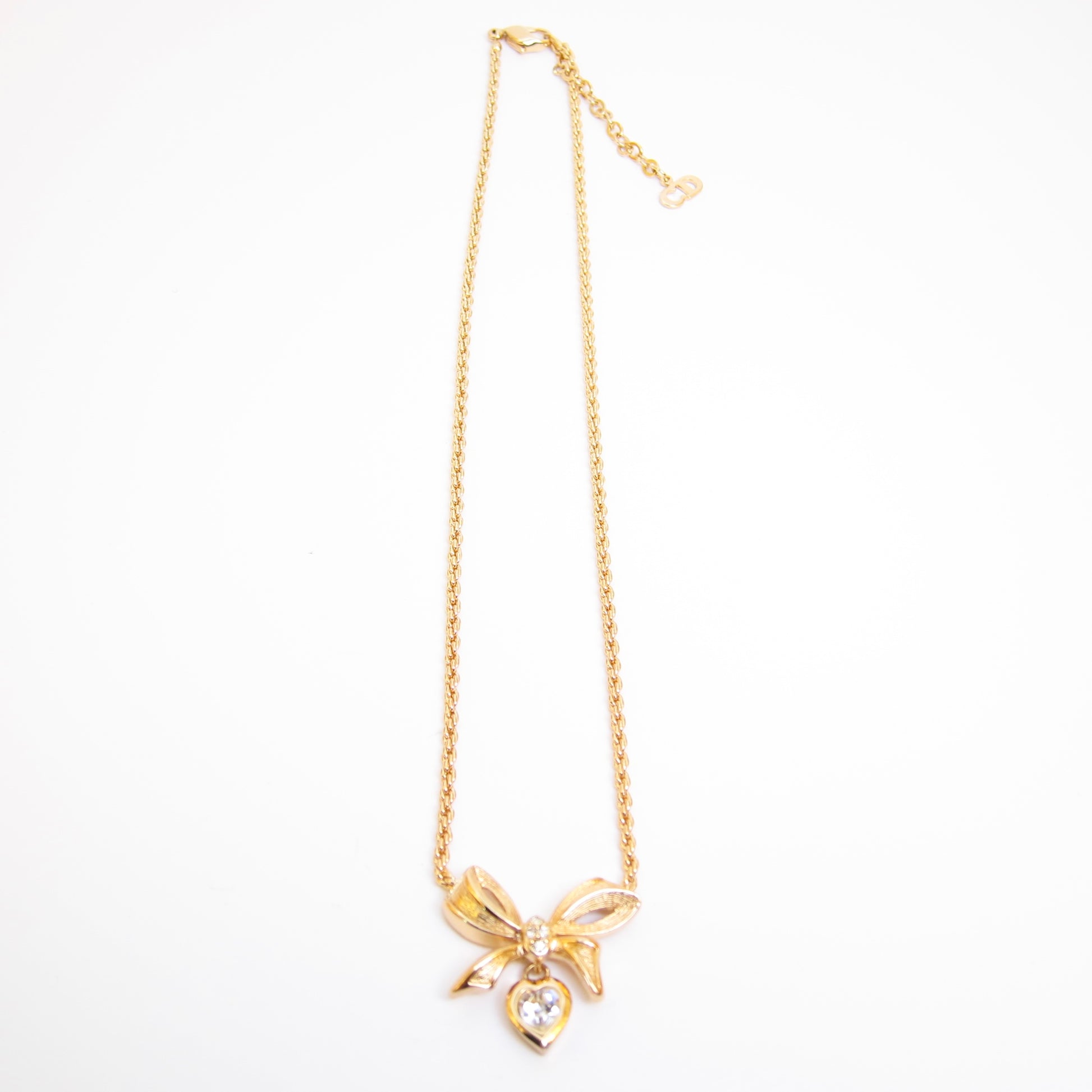 Christian Dior Vintage Ribbon and Heart with Rhinestone Golden Necklace