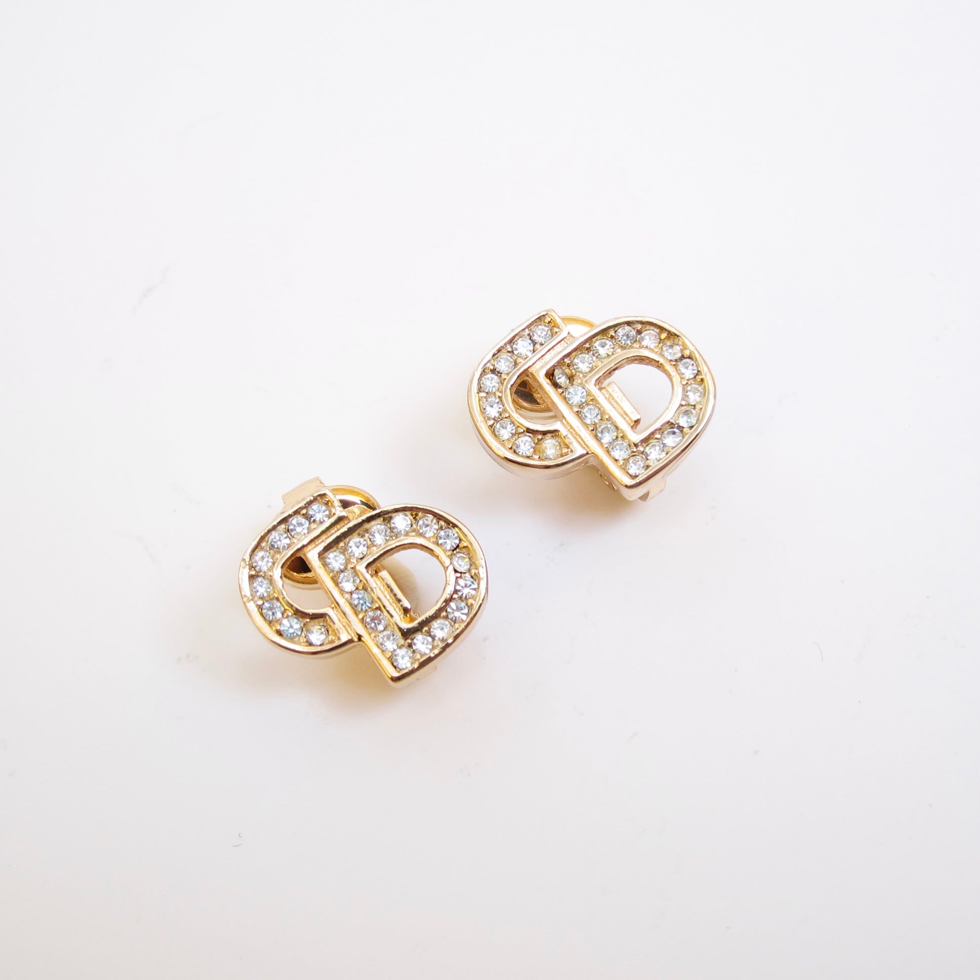 Christian Dior Vintage CD Logo with Rhinestone Golden Clip-on Earrings