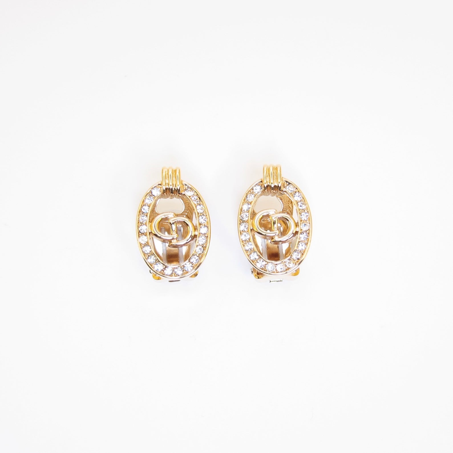 Christian Dior Vintage CD Logo in Oval Shape with Rhinestone Golden Clip-on Earrings