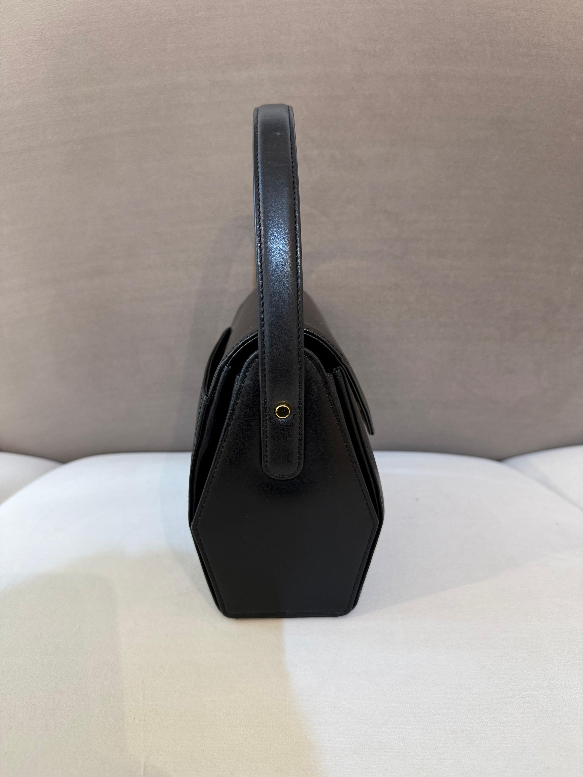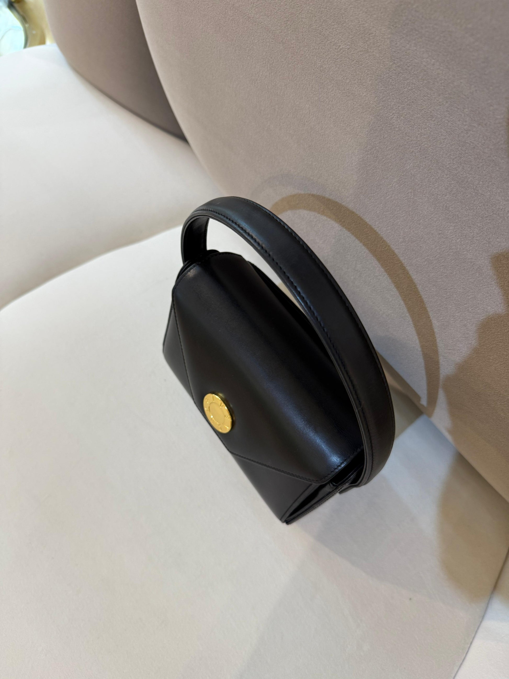 This vintage Givenchy handbag captures Parisian sophistication through its architectural silhouette and signature gold medallion clasp — a hallmark of the maison’s 1970s aesthetic.
