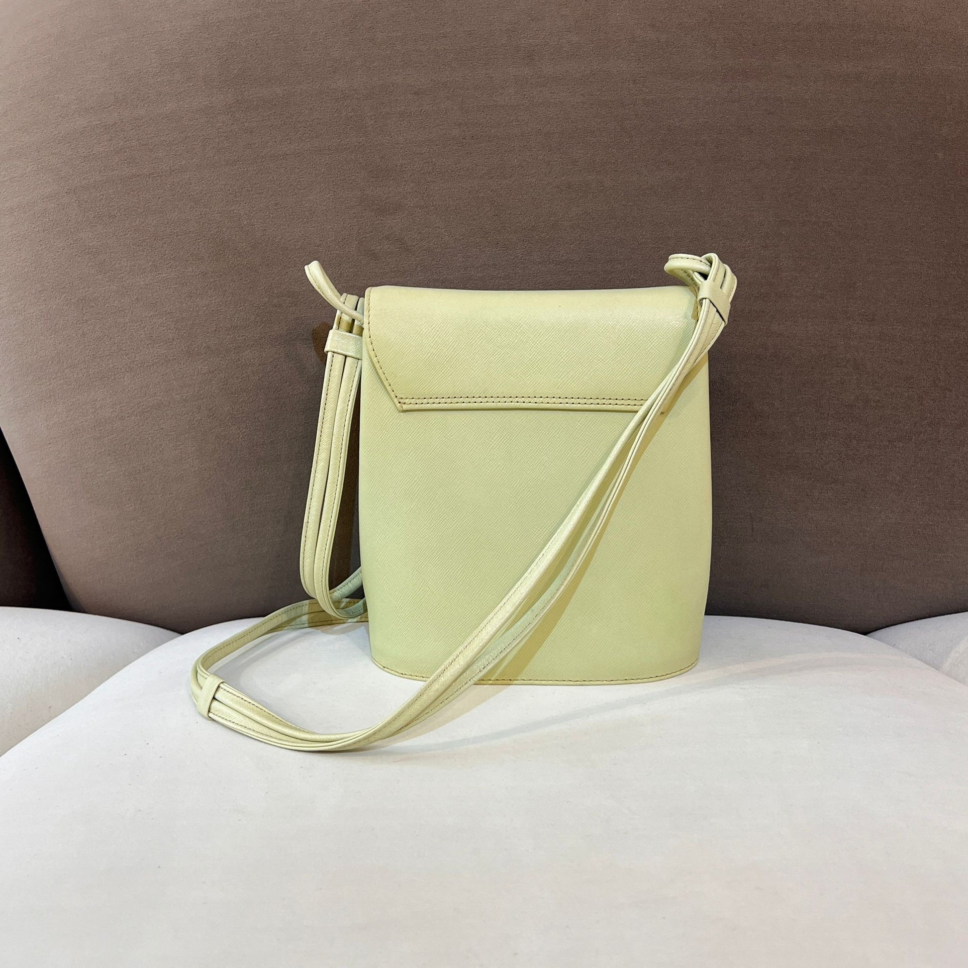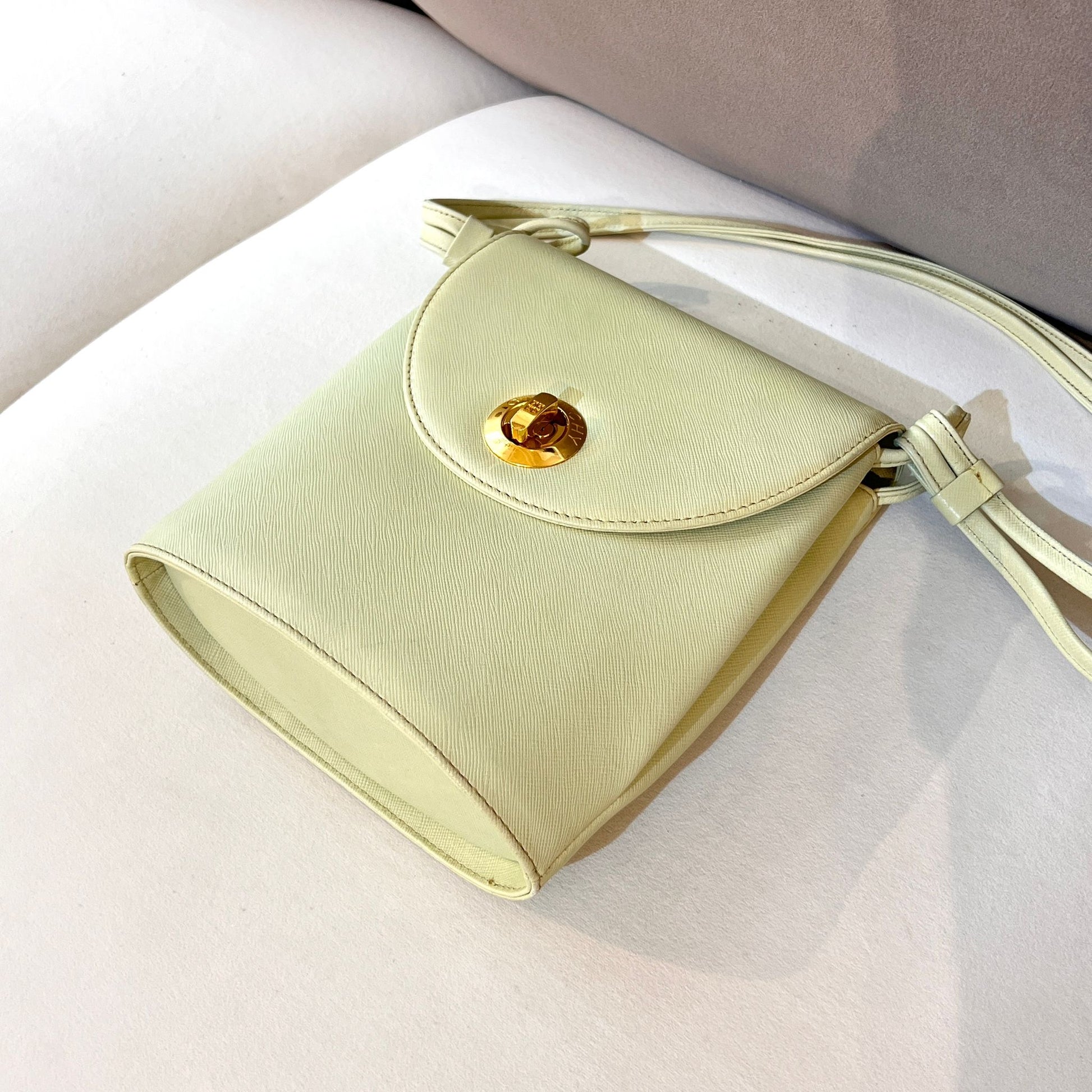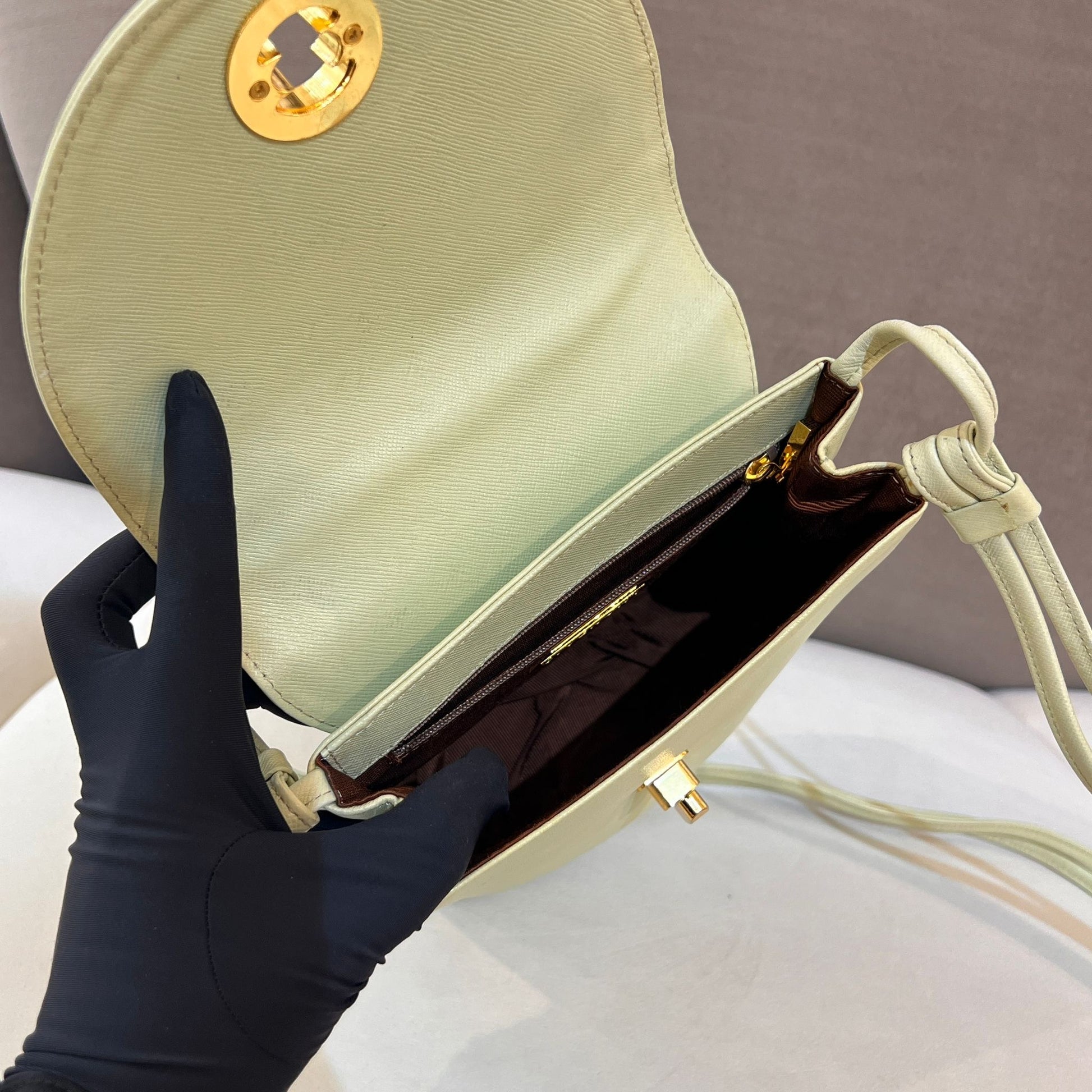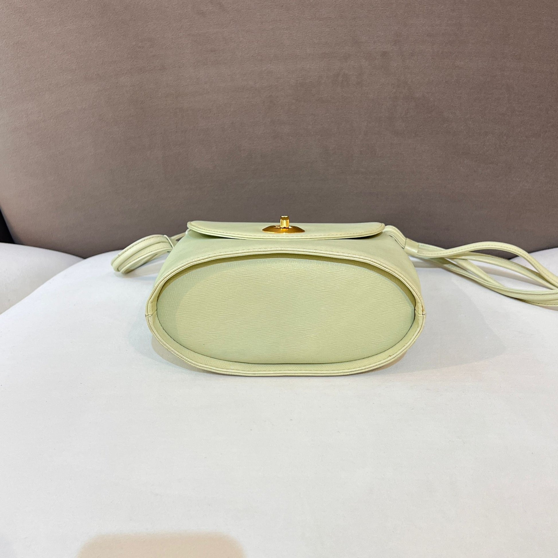 This rare Givenchy shoulder bag features a soothing mint green hue and a gold medallion clasp, reflecting the maison’s late 1970s elegance and architectural precision.