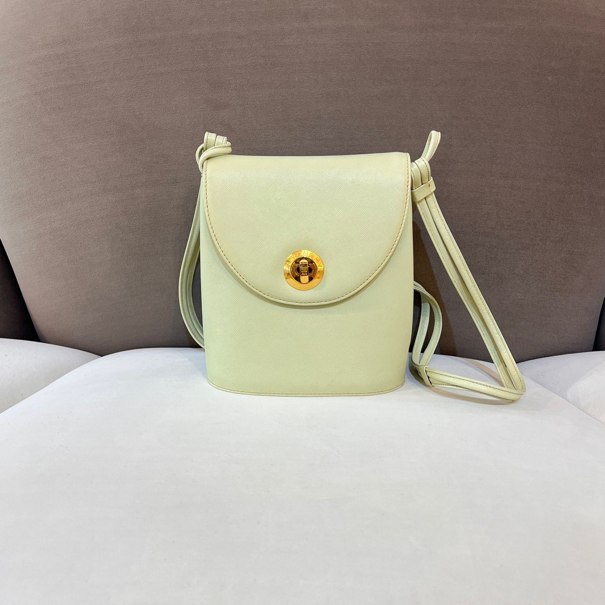 這款珍稀Givenchy肩袋以柔和薄荷綠皮革搭配金色圓形扣飾,體現品牌1970年代末的優雅與結構美學。