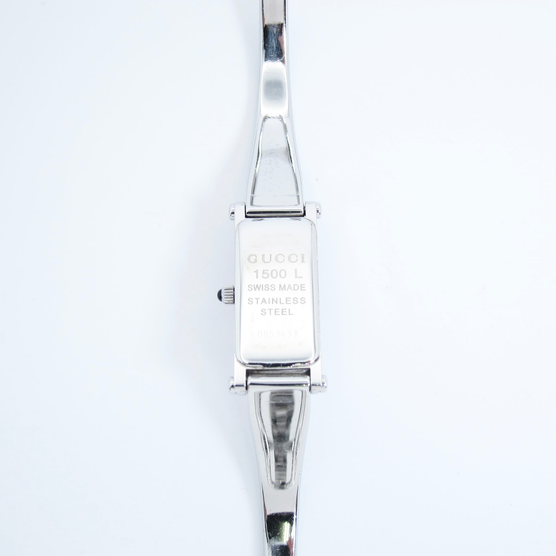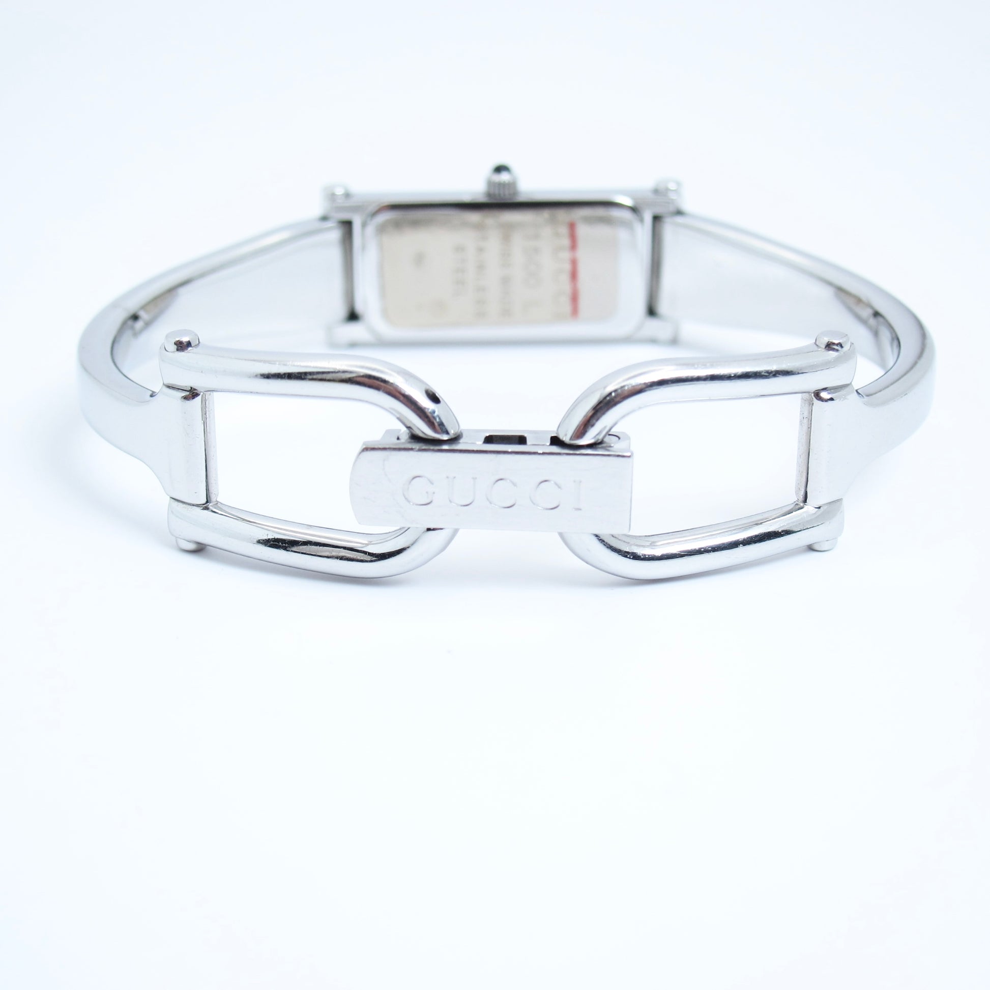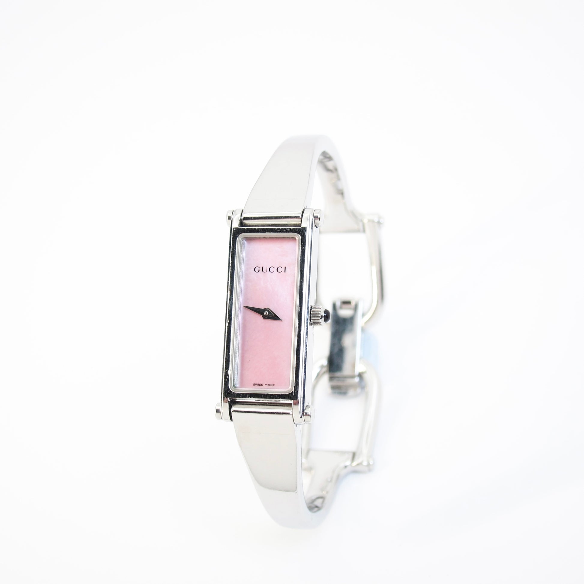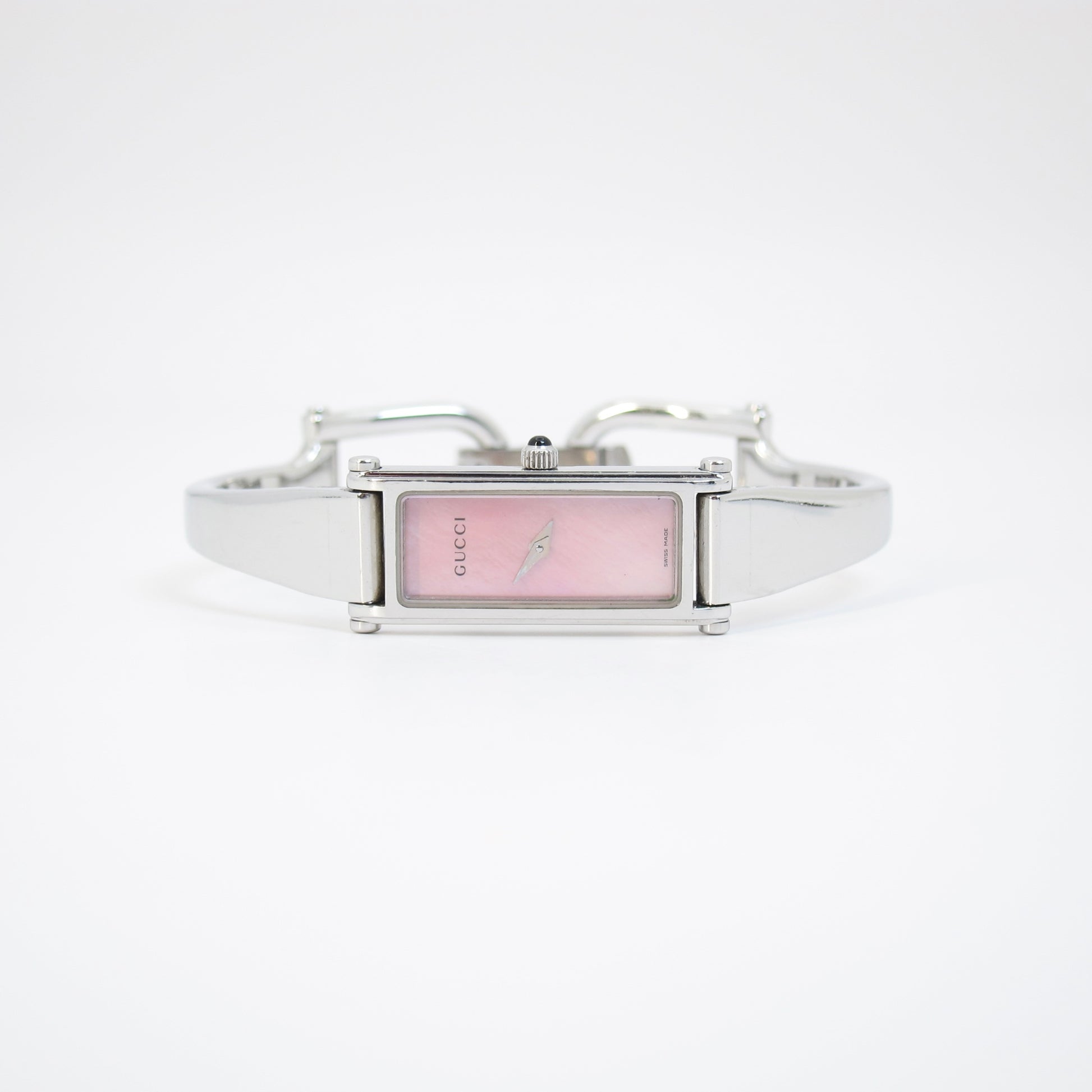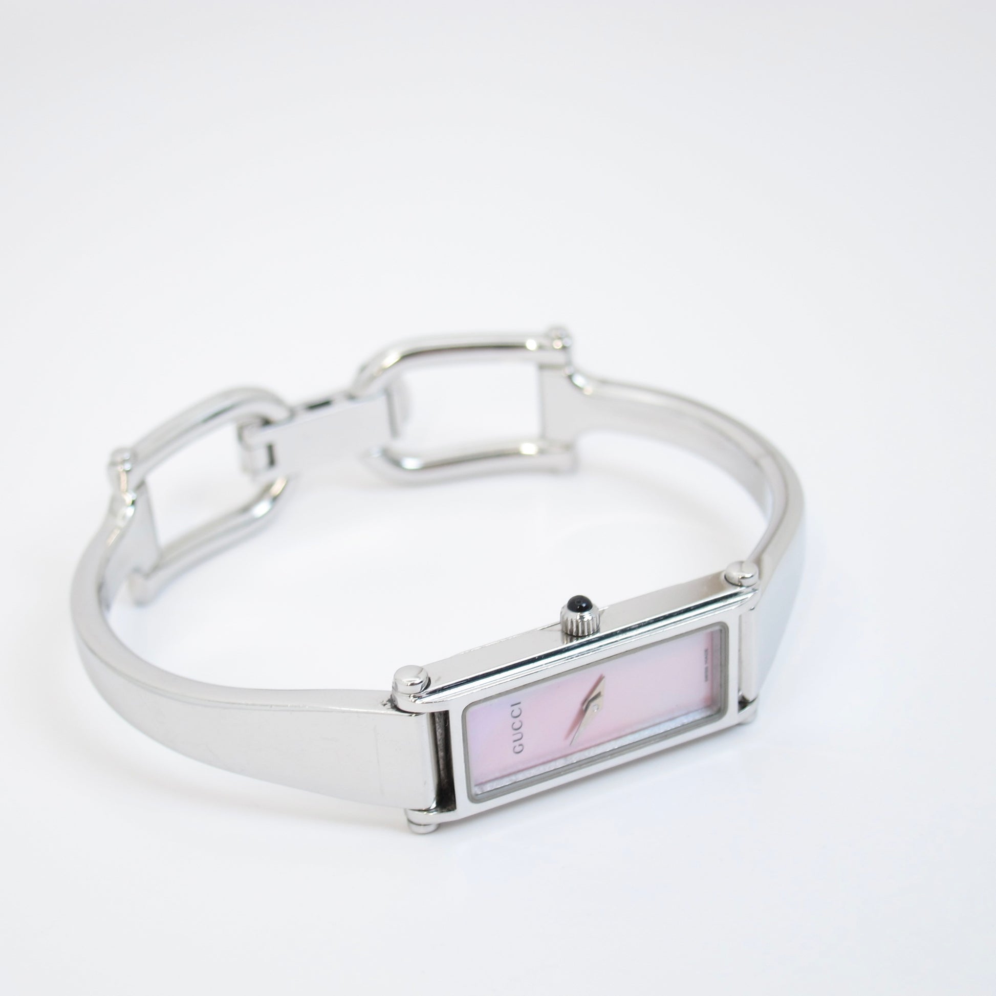 Gucci Vintage Rectangle Pink Shell Pearl Face Silver Bangle Watch