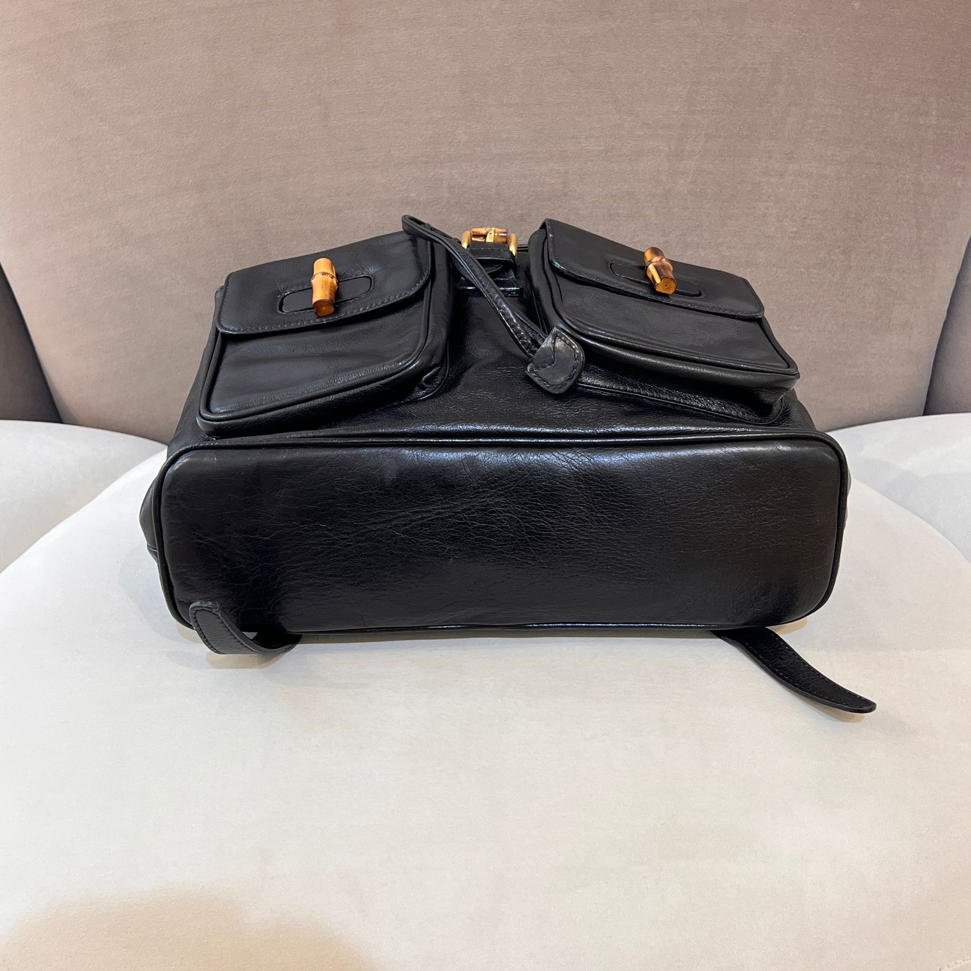 An iconic design from Gucci’s post-war bamboo series, this black leather backpack combines practicality with heritage luxury. The dual-pocket structure, complemented by natural bamboo hardware, showcases Italian craftsmanship at its finest.