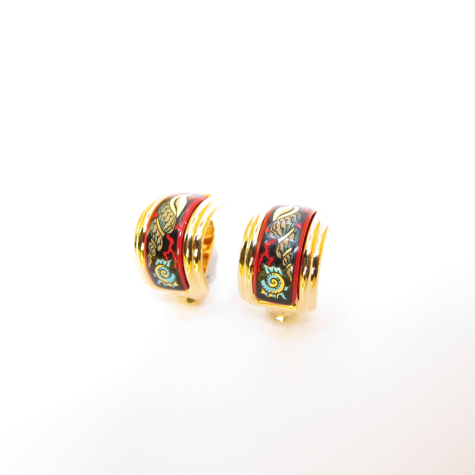 Hermes Vintage Shell Cloisonne Enamel Golden Clip-on Earrings