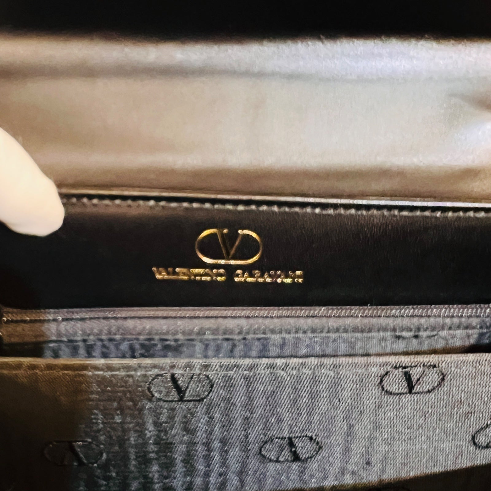 This Valentino Garavani vintage handbag showcases a structured top handle silhouette crafted in signature Epi-textured leather. Its elegant black tone pairs with a discreet gold-stamped interior logo, offering collectors a refined piece of Italian craftsmanship.