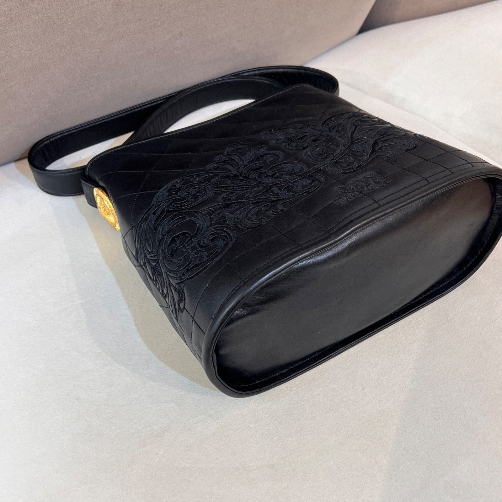 Versace Vintage Quilted Leather Baroque Bucket Shoulder Bag Black