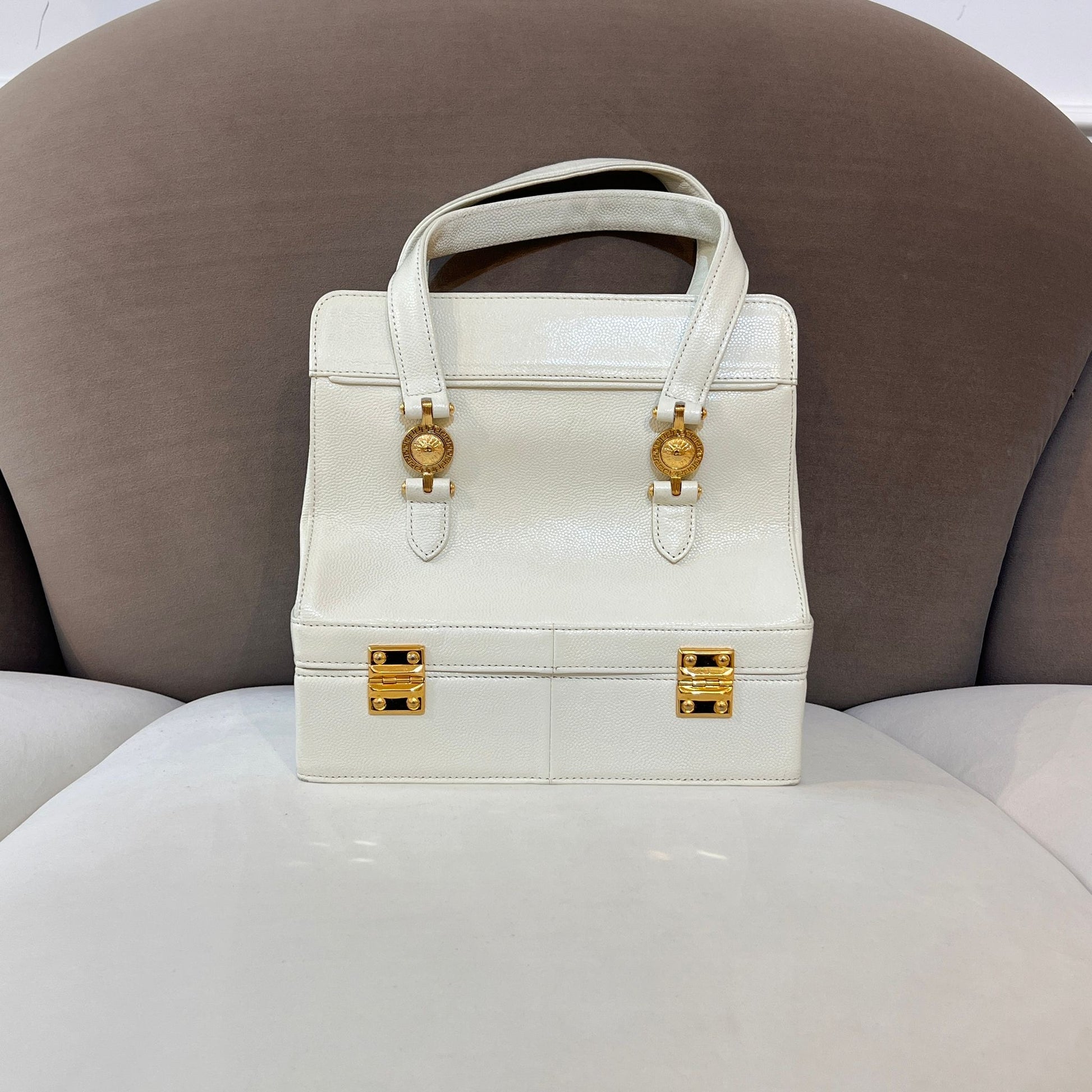 This Gianni Versace handbag embodies the brand’s golden age — crafted in luxurious white leather and adorned with iconic Medusa medallions, it captures the essence of 1990s Italian glamour.