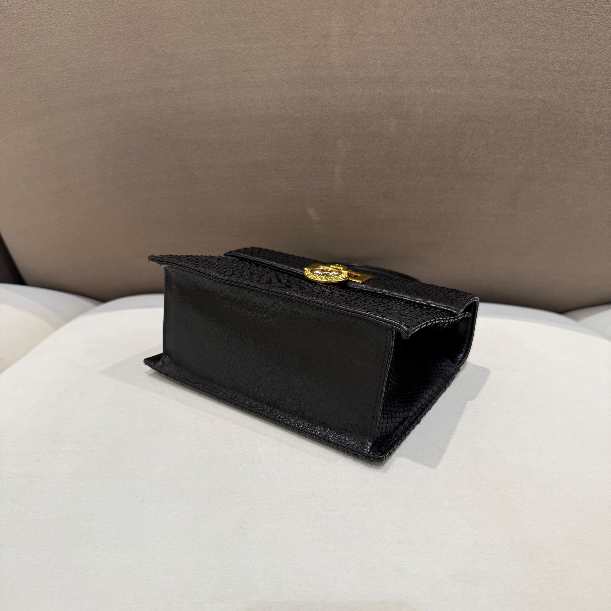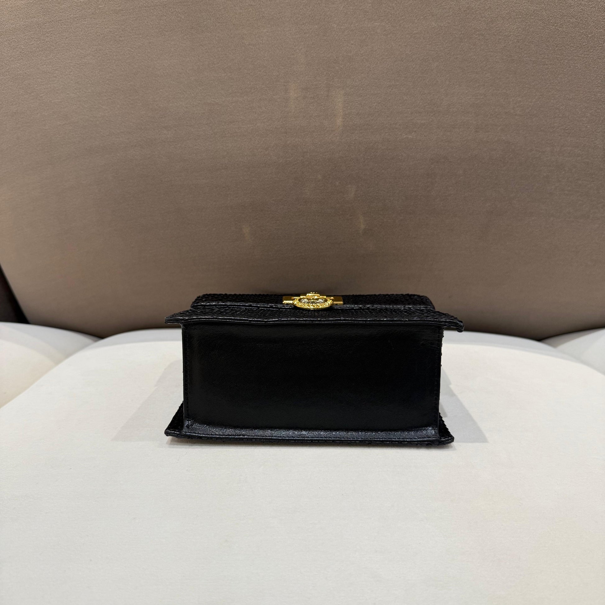 此款 Versace 中古手袋採用黑色蟒蛇紋理皮革製成,盒型結構分明,搭配標誌性圓形金屬扣飾,展現品牌一貫的華麗風格。