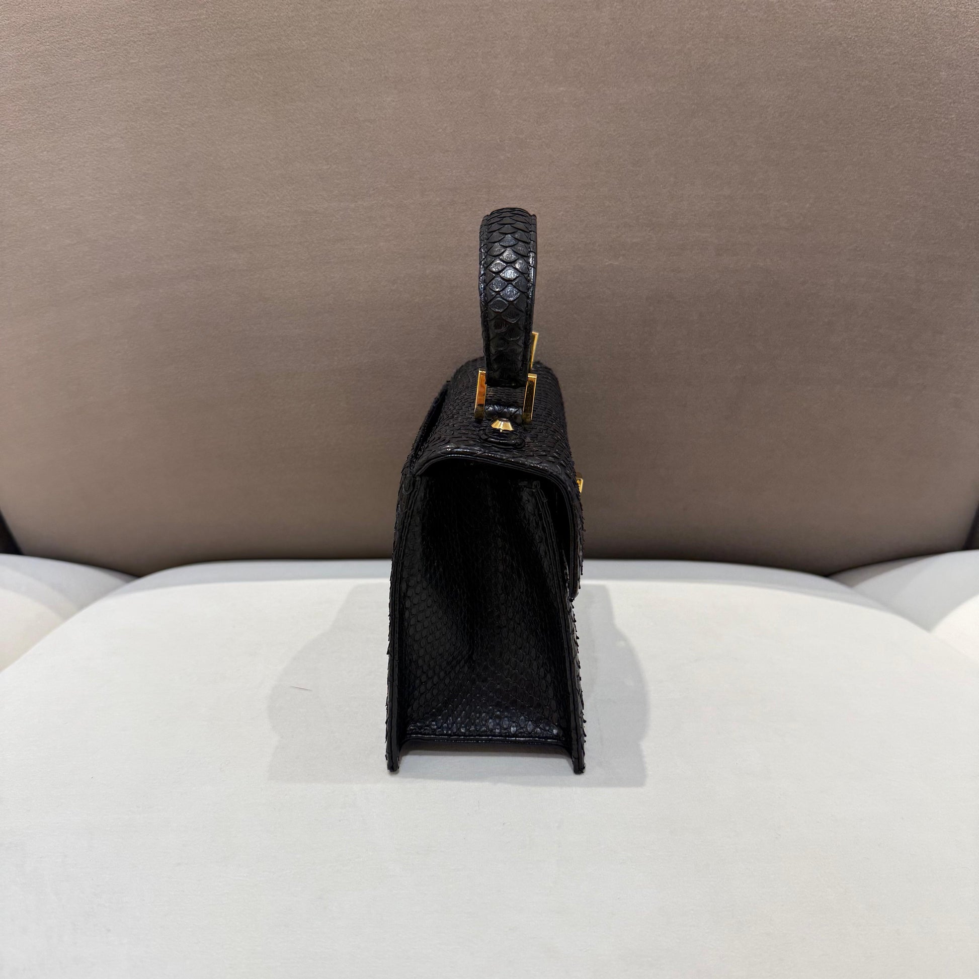 This vintage Versace handbag features a compact box-shaped silhouette crafted in black python-textured leather, finished with a bold gold-tone medallion clasp that reflects the brand’s signature glamour.