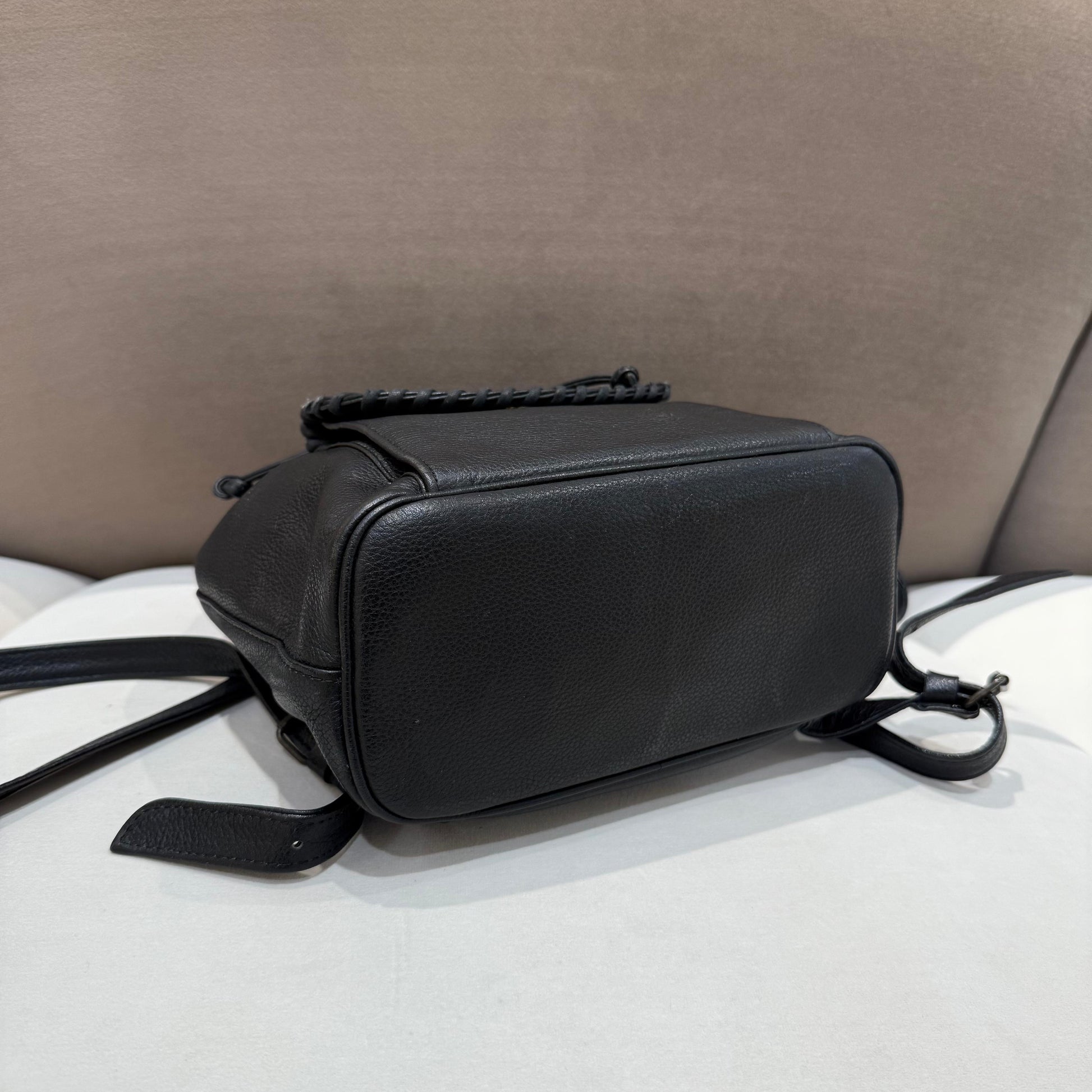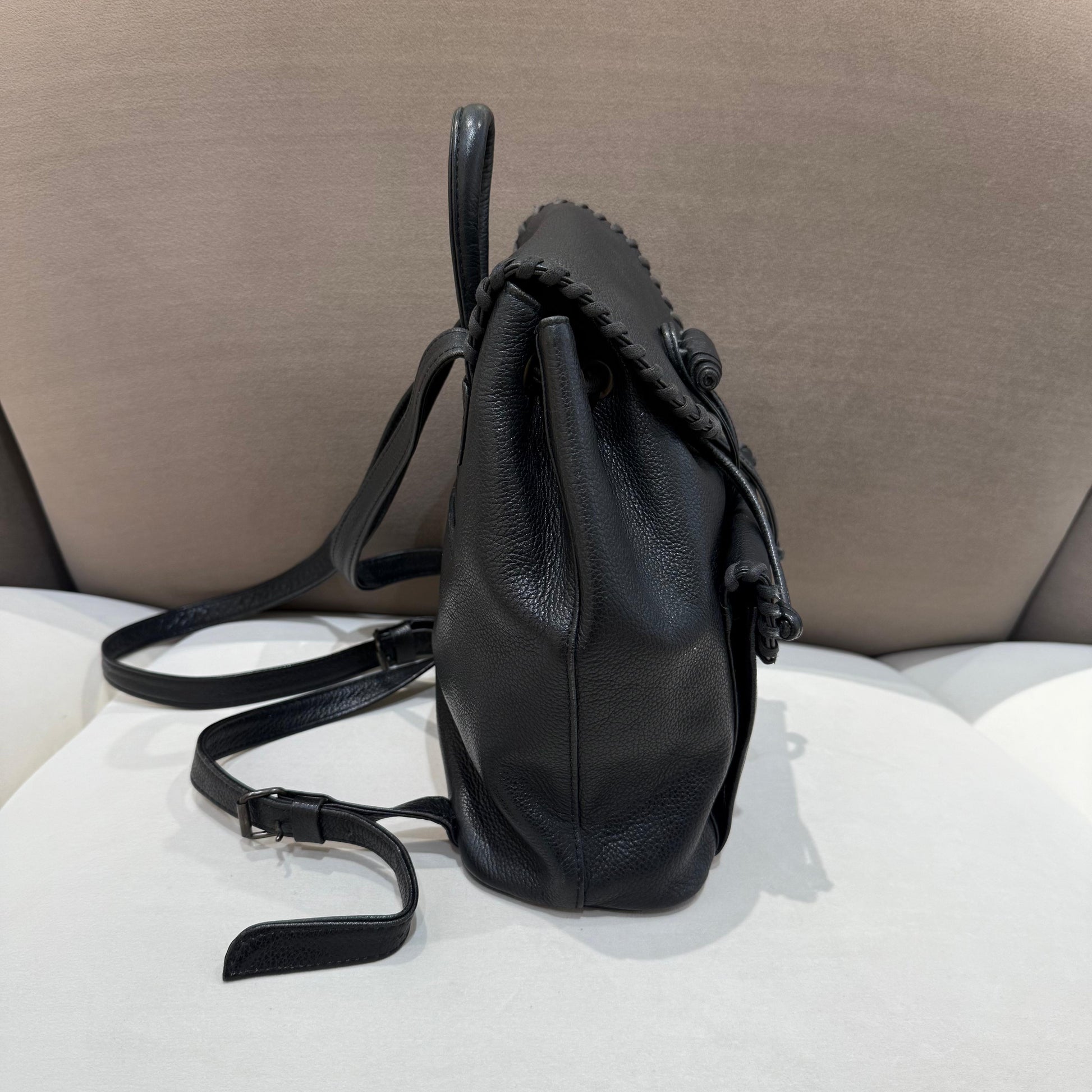 This vintage Yves Saint Laurent backpack is crafted in black leather with a softly aged finish, featuring a drawstring closure and stitched flap details that reflect practical elegance.