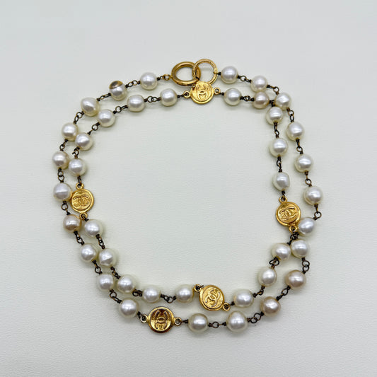 香奈兒復古金色 CC 標誌圖案搭配珍珠長項鍊