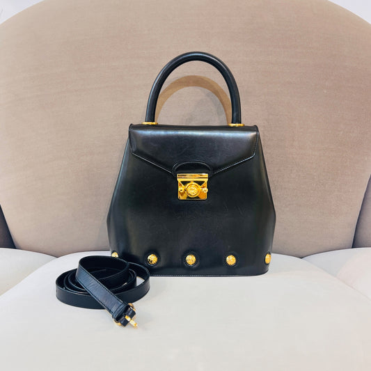 Ferragamo Vintage Black Leather 2-Way Handbag With Gold Medallions
