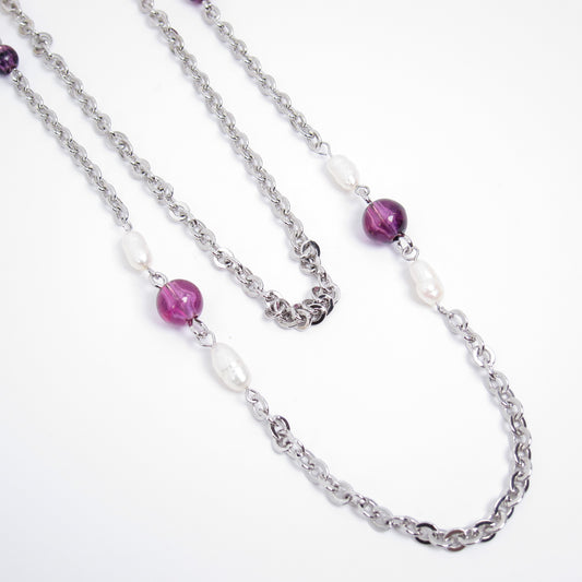 Givenchy Vintage Pearl and Purple Bead Silver Long Necklace