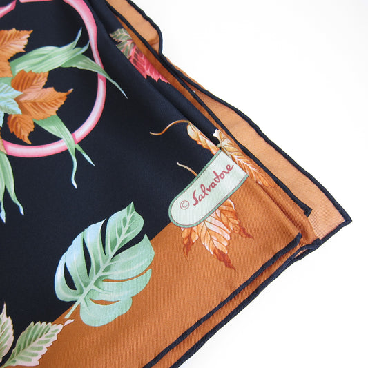 Ferragamo 復古樹葉圖案黑棕色真絲圍巾
