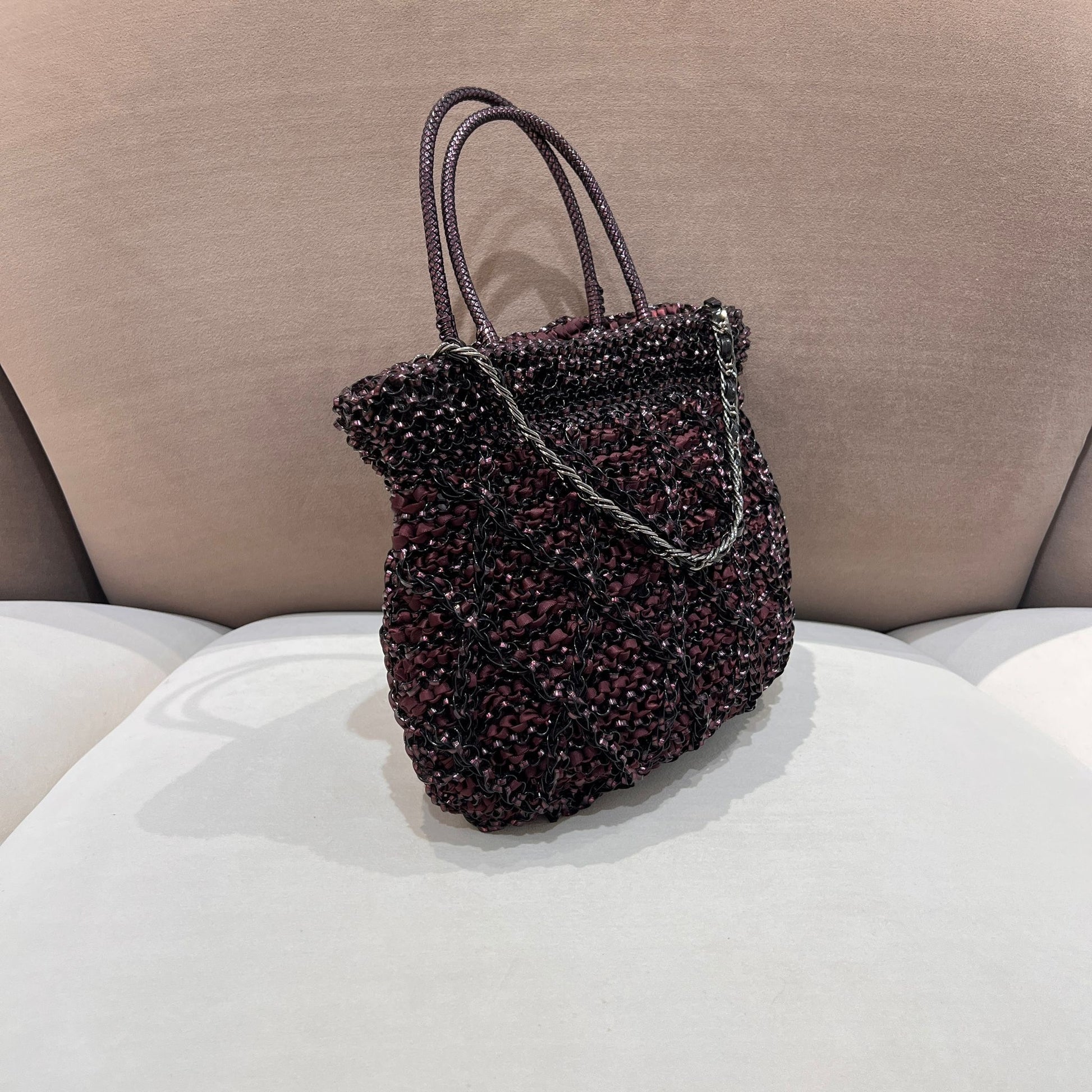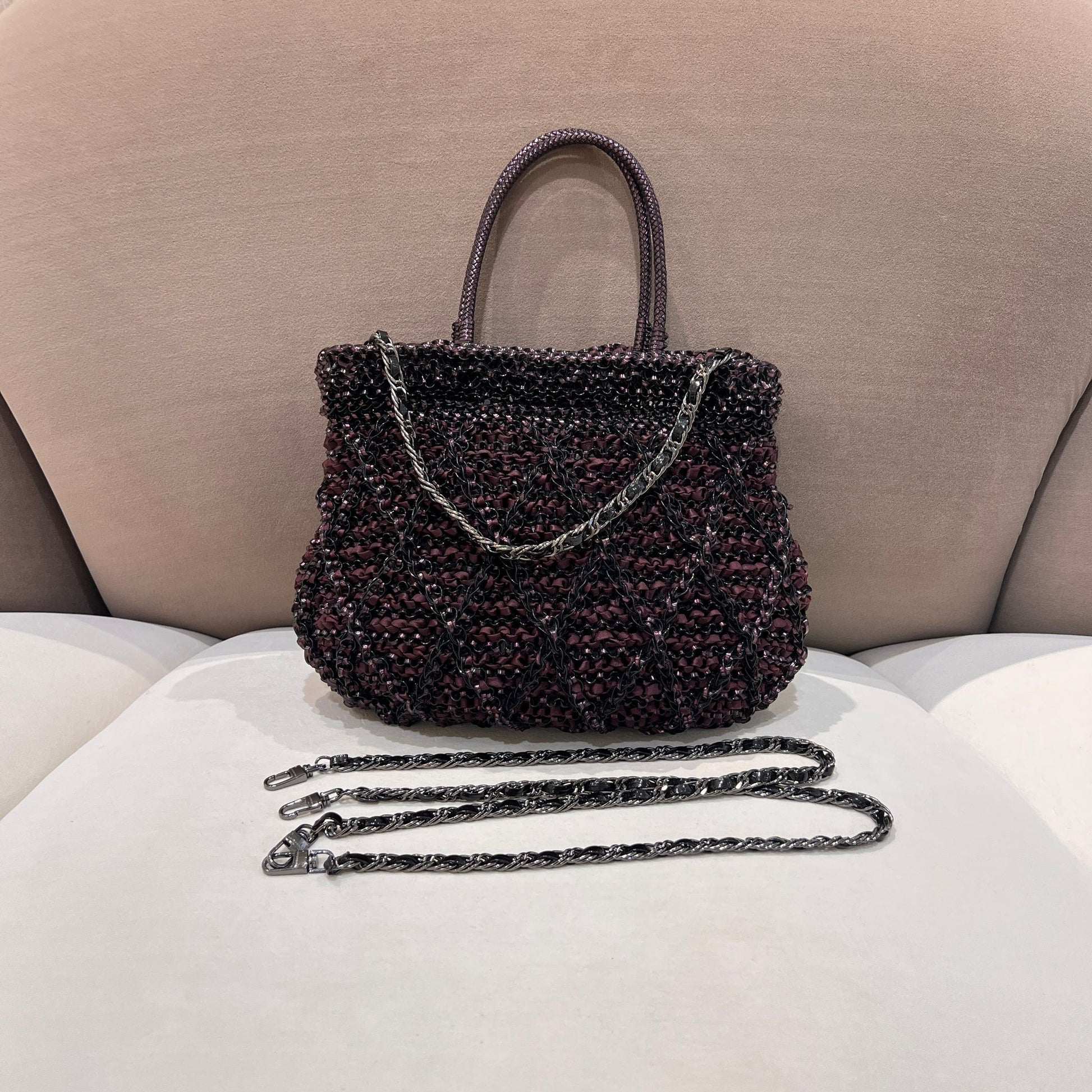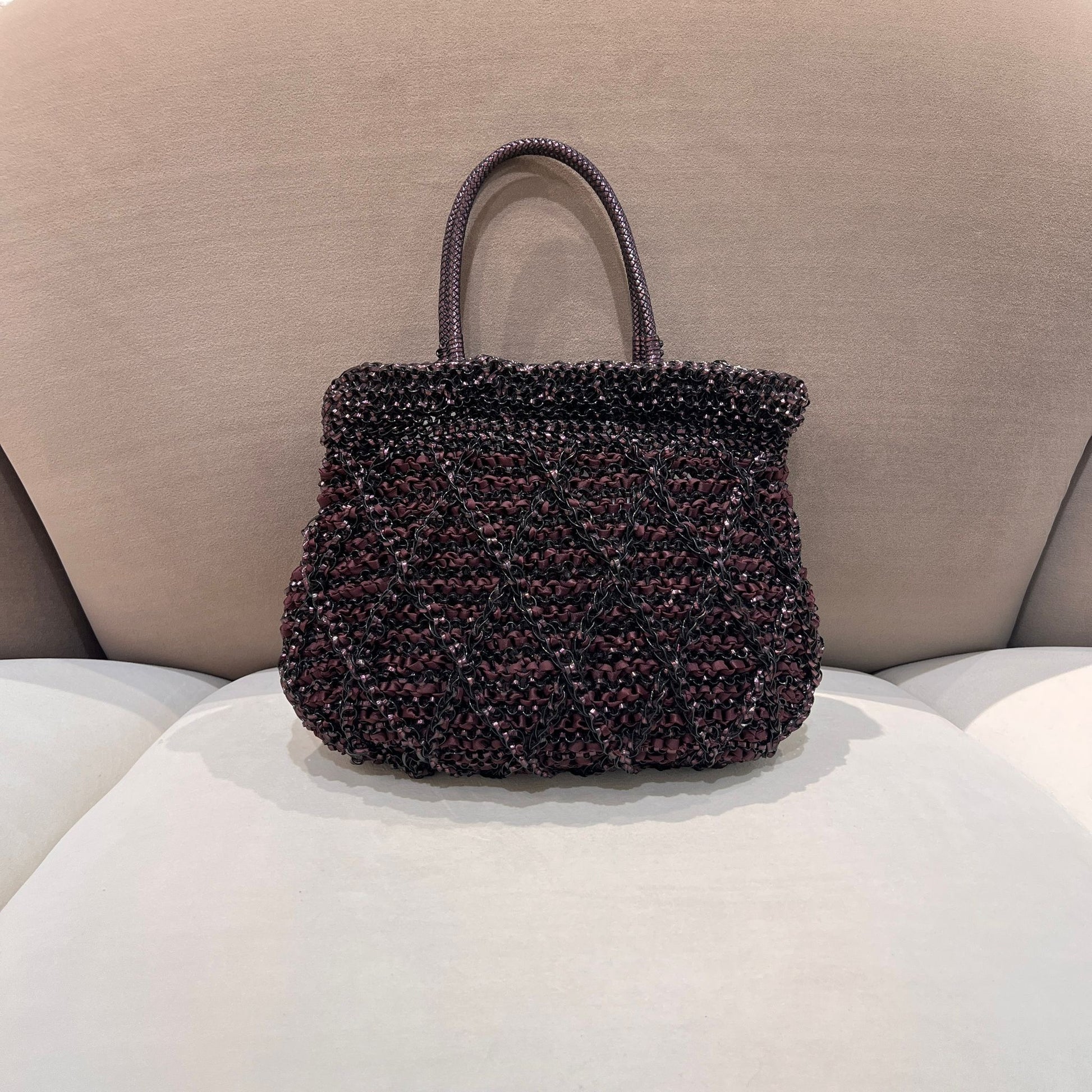 此款ANTEPRIMA手袋採用品牌經典金屬線編織技術,深色調層次豐富,袋身柔韌性可塑,搭配多種背法設計,兼具造型感與實用性。